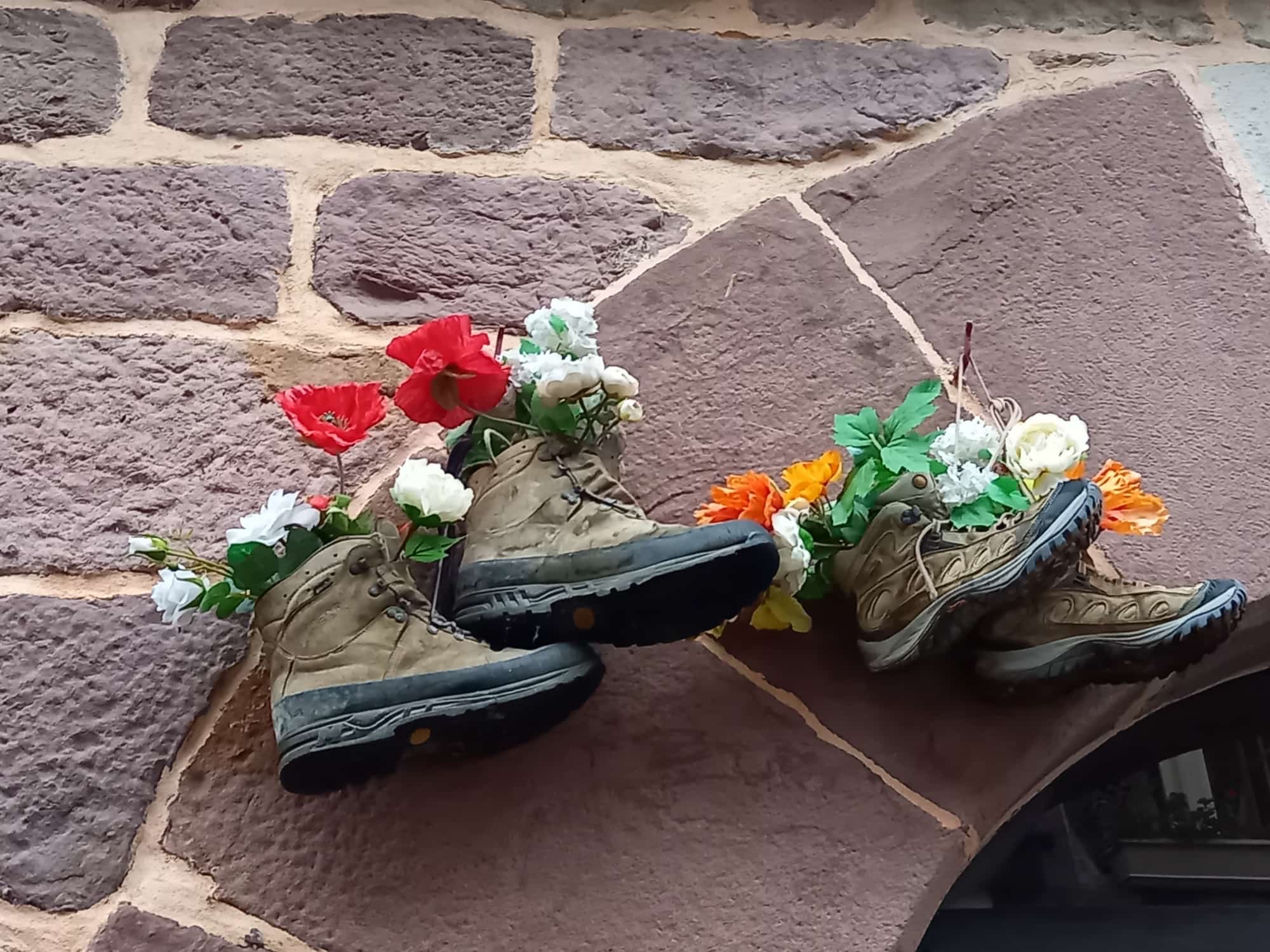 Wir können noch in die Stadt mit ihren bunten Gassen und Hunderten Pilgern. Hier ist der Start des Camino Frances. Tausende starten von hier aus zu ihrer Pilgerreise. Es gibt unzählige Pilgerherbergen. Doch alle sind: Complet. Gut, dass wir unser Zelt haben. Wir sind ja auch Radreisende und keine Pilger. Trotzdem lassen wir uns einen Pilgerausweis ausstellen. Die Dame der Amis de Camino registriert aber nicht, dass wir die Strecke mit dem Rad fahren wollen. Sie erklärt uns das strenge Reglement des Camino und die Infrastruktur auf dem Weg. Die letzten 100 km müssen sich Wanderer in ihrem Pass zweimal täglich abstempeln lassen, um in Santiago die sogenannte Compostela zu erhalten. Die Compostela ist die Urkunde der Jakobspilger. Wir sind als Radfahrer echte Pilger, wenn wir das auf den letzten 200 km tun. Mal sehen. Eine Muschel lassen wir uns geben. Sie weist uns als Pilger aus.