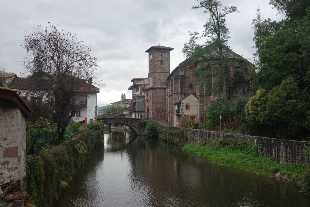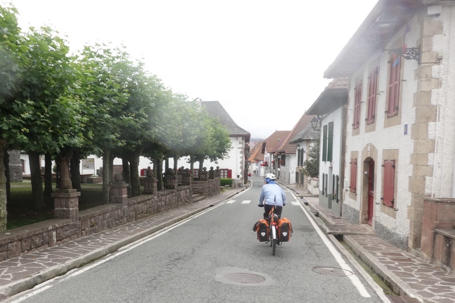 Wie war das nochmal bei unserer Entscheidungsfindung? Ein Vorteil der Route durch das Inland sollte sein: es ist trockener als an der Küste. Schon an unserem ersten Tag auf dem Camino haben wir Nieselregel. Es gibt zwei mögliche Routen. Der EuroVelo 3 oder die Passstraße in Richtung Pamplona. Wir nehmen die Straße. Bis zur spanischen Grenze ist viel Verkehr. Dort gehen die Franzosen billig einkaufen und fahren zurück. Der Verkehr lässt nach. Es geht stetig bergauf. Mit moderater Steigung. Wir fahren durch malerische Dörfer mit Häusern im baskischen Stil. Dann nur noch durch Wald. Der Regen nimmt zu. In Regenkleidung schwitzen wir am Berg.