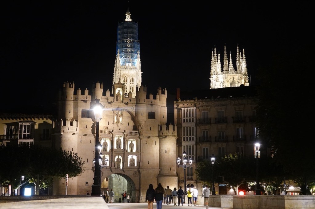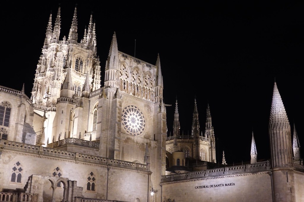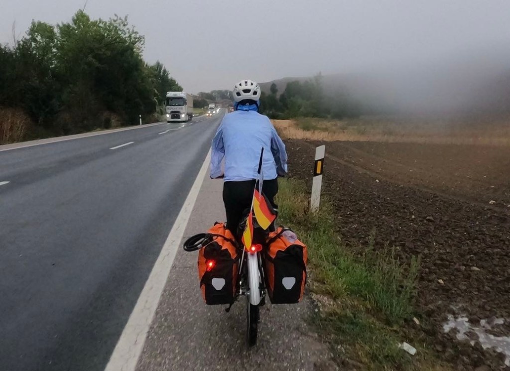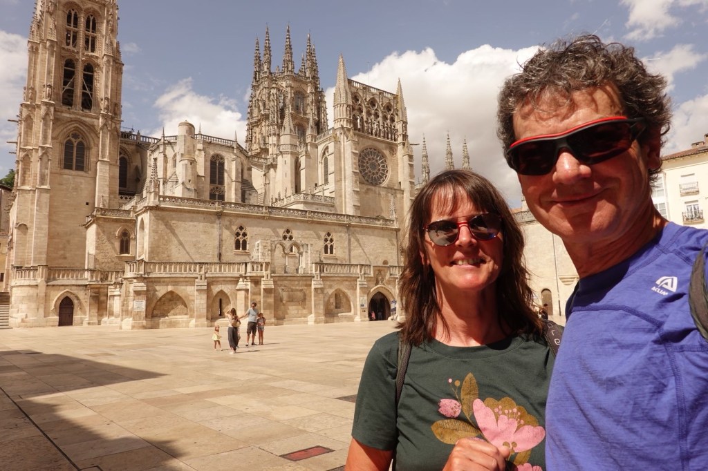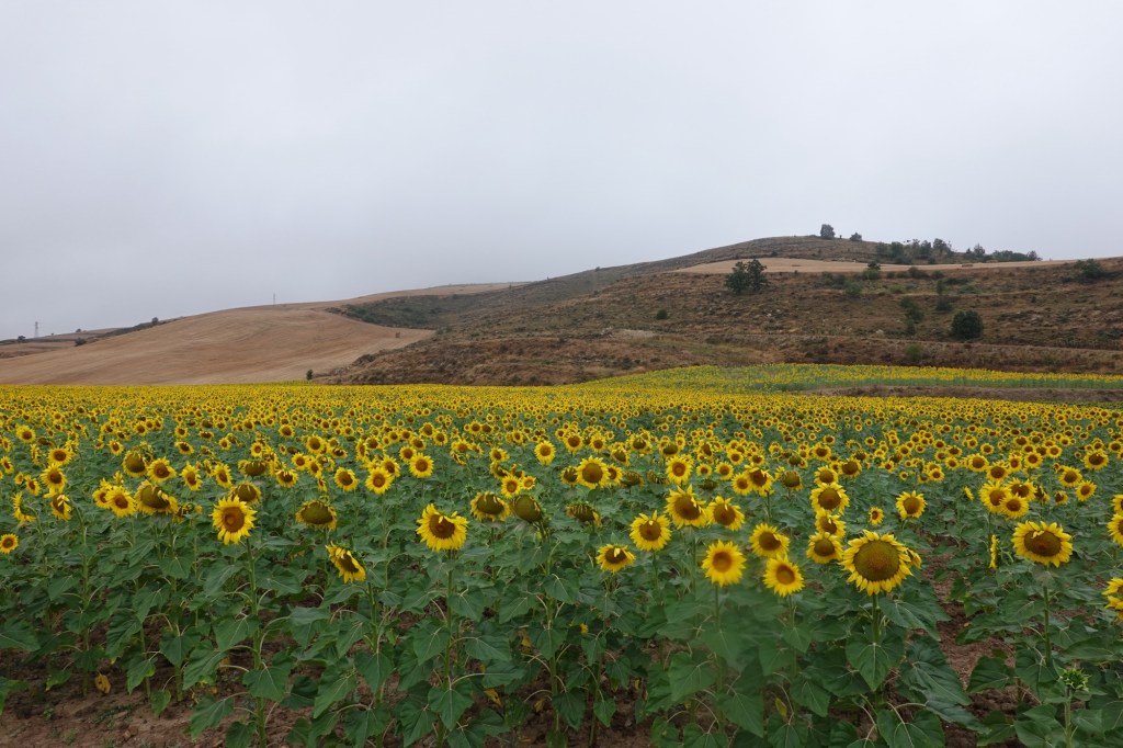 Die Wettervorhersage stimmt. Pünktlich am Morgen gibt es ein Gewitter. Es regnet heftig. Danach nur noch schwach. Wir können los. Es ist heute Wetter wie dehemm- für Nichtsaarländer: Wetter wie zuhause. Regen und 17 Grad. Angenehm gegenüber der gestrigen Hitze. Klaus hat eine Alternative zum Camino ausgesucht. Zwei Gravelbiker fahren mit uns los. Die beiden auf dem Camino, wir biegen in die Berge ab. In Burgos sehen wir sie zufällig wieder. Wir schlendern schon frisch geduscht durch die Stadt, die beiden sind mit ihren verschlammten Rädern gerade erst angekommen. Unsere Strecke war länger, aber außergewöhnlich schön. Trotz Regen. Wir hatten ockerfarbene Hügel mit grünen Tälern und gelben Sonnenblumenfeldern. Und keinen Verkehr. Erst vor Burgos und bei der Stadteinfahrt. Zu unserem Hotel ging es über Radwege.