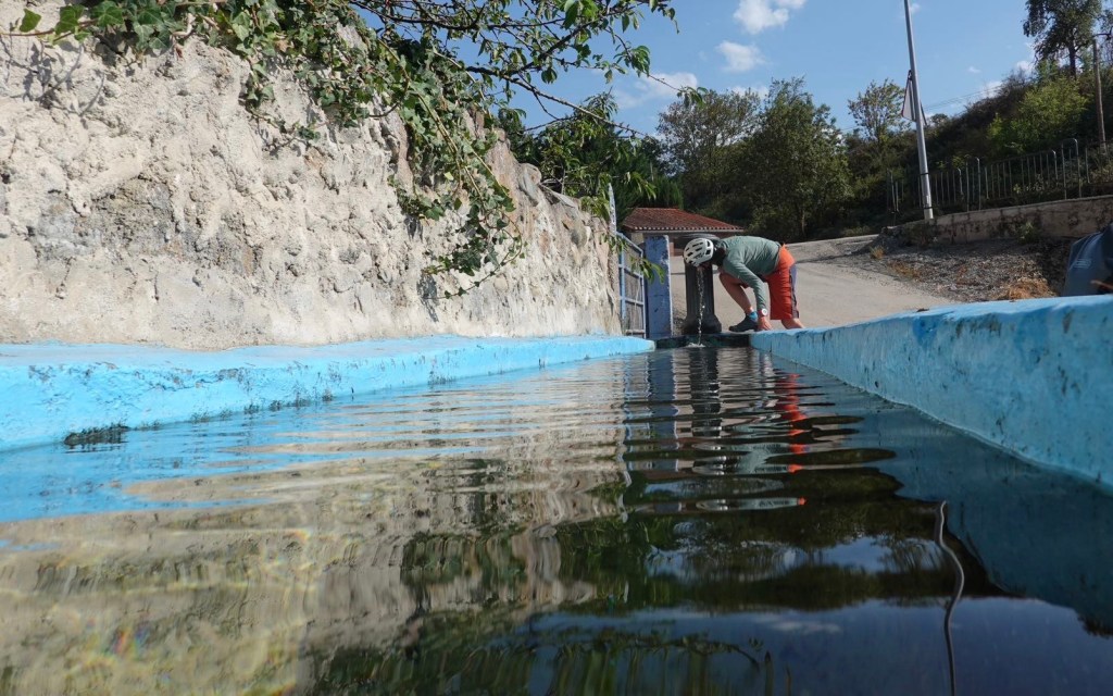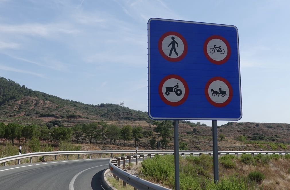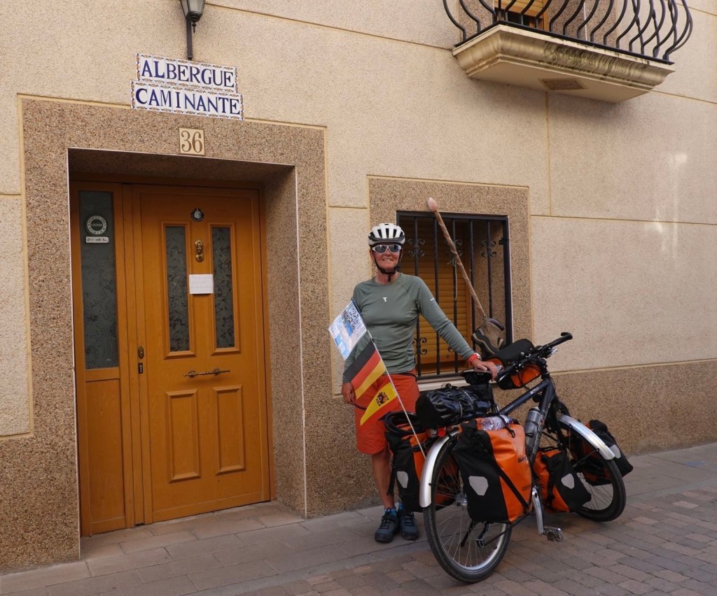 Die Temperaturanzeige neben einem Café zeigt 55 Grad. Defekt oder direkte Sonne? Auf dem Tacho sind es in der Sonne 43 Grad. Das ist auch zu viel. Wir zapfen uns extra Wasser an Brunnen ab, um uns unterwegs nass zu machen. Es ist kaum auszuhalten. Dann müssen wir wieder auf den Camino. Auf Gravel bergauf ohne Fahrtwind. An einer riesigen Autobahnbaustelle werden wir umgeleitet. Es ist wie in einer Wüste. Die armen Pilger tun uns leid. Sie laufen kilometerweit über diese Baustelle, vorher endlos entlang der Autobahn. Alles andere als eine schöne Strecke. Und dann die brutale Hitze. Wir wollen möglichst schnell zu unserem Tagesziel. Am schnellsten geht es über die Hauptstraße. Sie hat einen breiten Seitenstreifen. Augen zu und durch. Bis Belorado. Dort haben wir eine Albergue gebucht. Camping gibt es nicht. Am Ortseingang dann eine Überraschung. Ein Trinkwasserbrunnen mit einer 10 m langen Wanne. Sabine zieht sofort die Schuhe aus und watet durch. Eine tolle Abkühlung. In der Albergue bekommen wir für 14 Euro ein echt leckeres Menü mit Wasser und Wein. Selbst kochen lohnt sich in Spanien nicht.