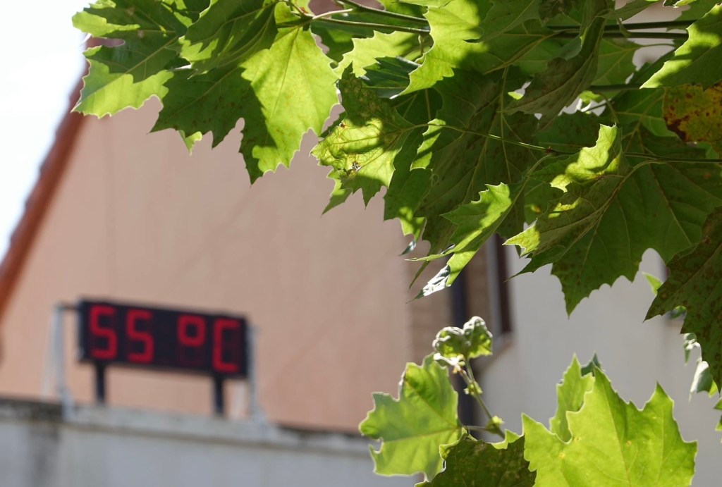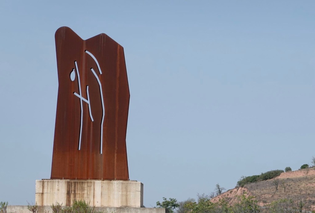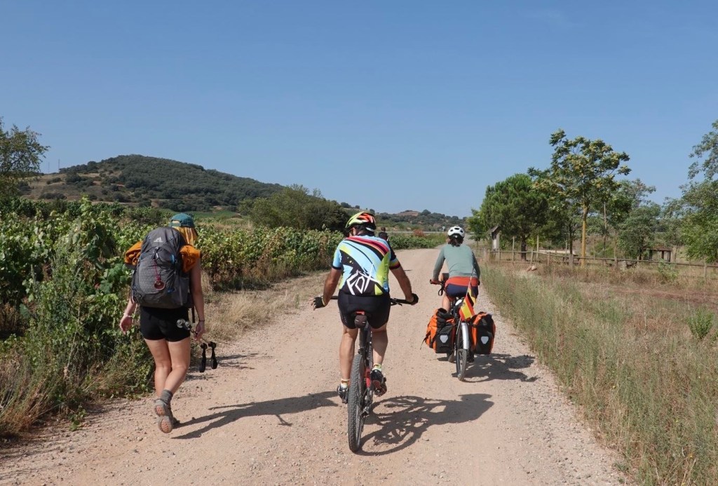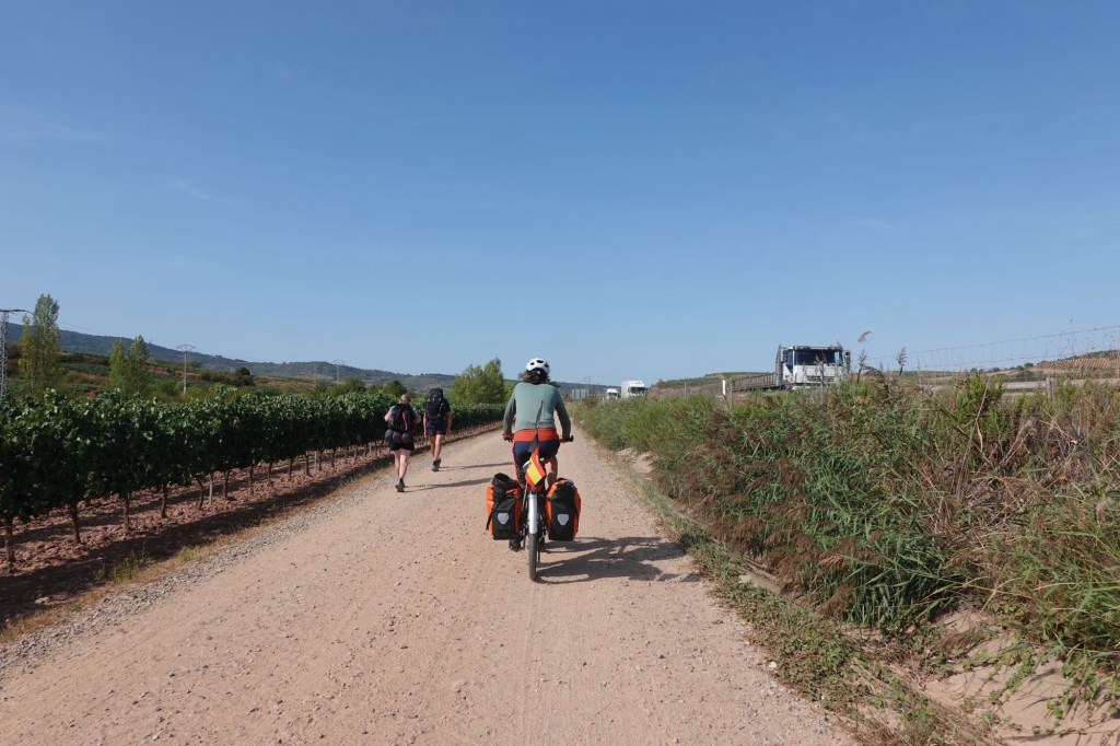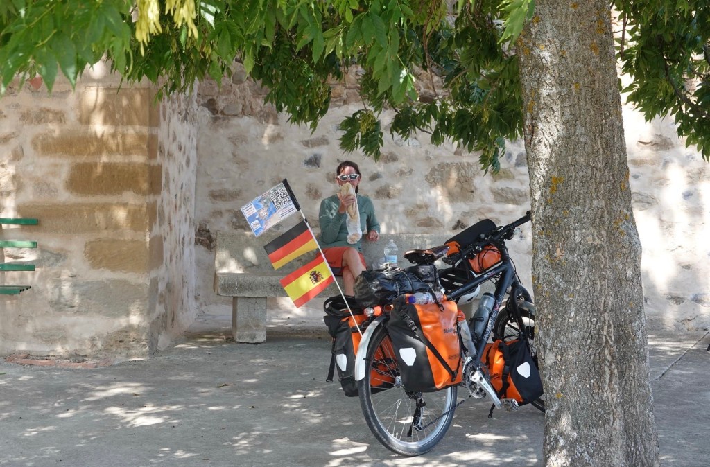 In der Morgendämmerung packen wir unser Zelt zusammen. Vielleicht schaffen wir es ja, wenigstens morgens noch einige Zeit erträgliche Temperaturen zu haben. Wir nehmen den Camino aus der Stadt hinaus. Unzählige Wanderer sind unterwegs. Nicht nur Pilger, sondern auch Stadtbewohner, die sich bewegen wollen bevor es zu heiß wird. Und heiß soll es heute werden. Ein Mountainbiker gesellt sich zu uns. Er spricht nur Spanisch. Irgendwie verstehen wir uns. Er fährt bestimmt 10 km mit uns. Er könnte ohne Gepäck viel schneller fahren. Es macht ihm Spaß, uns den Weg zu zeigen. Wir wechseln dauernd zwischen dem Camino mit Gravel und Straßen ohne Verkehr. Allen Pilgern wünschen wir ein Buen Camino. An einem Kreisel verabschiedet sich der Spanier.