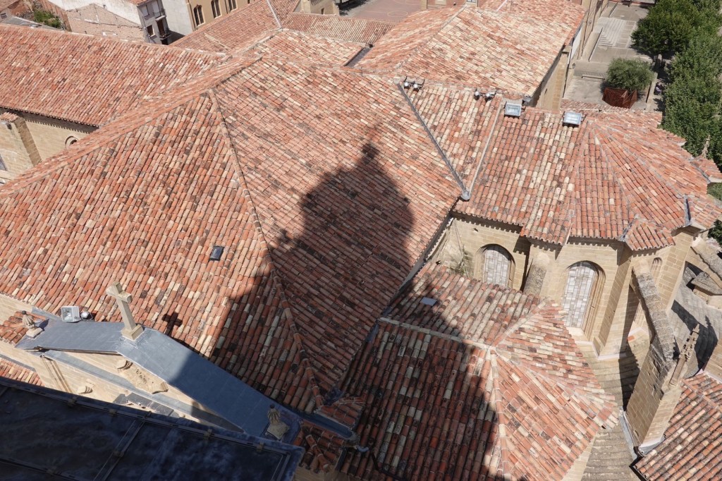Es wird heiß. Unerträglich heiß. Bergauf spüren wir keinen Luftzug. Bergab ist der Fahrtwind wie ein heißer Föhn. In Santo Domingo de la Calzada führt uns der Weg zu einer Kathedrale. Mit einem frei stehenden Glockenturm. Klaus macht sich zuerst zur Besichtigung auf. Der Turm schließt gleich. Klaus steigt die steilen Stufen nach oben. Sabine passt auf die Räder auf und hat gerade noch 10 Minuten Zeit. Die Dame an der Kasse will sie nicht mehr hoch lassen. Sabine: Ich bin schnell, ich bin rechtzeitig wieder unten. Berge mit dem Rad fahren ist einfacher. Die Oberschenkel brennen beim Hochlaufen. Die Aussicht lohnt sich. Und die Dame schließt hinter Sabine ab.