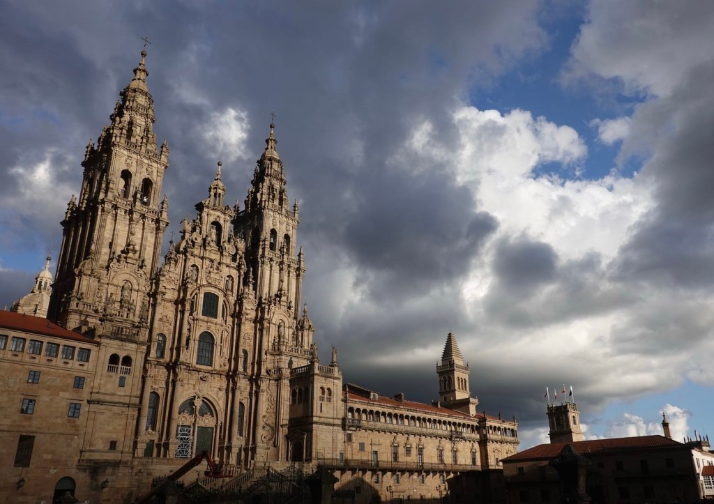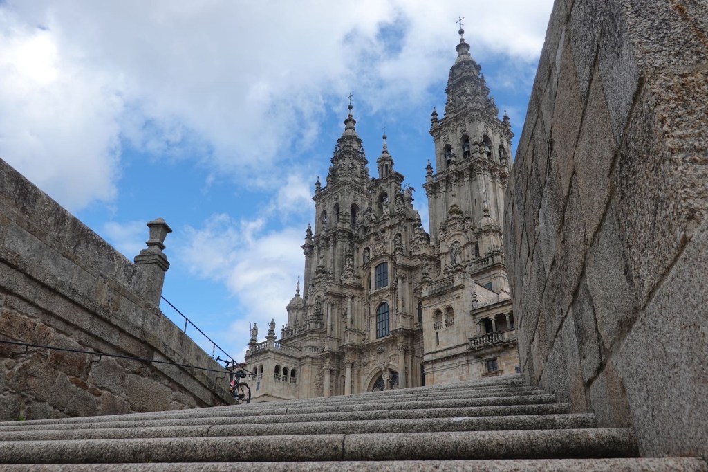 Plötzlich stehen wir vor der imposanten Kathedrale. Auf dem riesigen Platz davor Unmengen von Menschen. Vor allem Pilger. Mit Rucksack oder auch Rad. Sie liegen auf dem Boden und genießen den Blick auf ihr Ziel: die Kathedrale. Ihr Weg ist zu Ende. Wir dürfen noch weiter reisen. Wir haben gerade mal die Hälfte unserer Strecke geschafft. Am Abend bummeln wir durch die Stadt. In die Kathedrale wollen wir morgen.