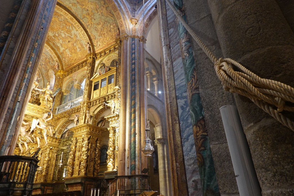 Schon ewig waren wir nicht mehr in einem Sonntagsgottesdienst. Die Pilgermesse in der Kathedrale um 9.30 Uhr wollen wir uns nicht entgehen lassen. Die Kirche ist voll. Alle Bänke in den drei Schiffen der romanischen Kathedrale sind besetzt. Die Messe ist sehr feierlich. Wenn auch auf spanisch. Wir schauen direkt auf den barocken Hochaltar mit der Krypta des Apostels Jakobs. Höhepunkt der Messe ist das Pendeln des großen Weihrauchkessels Botafumeiro. Wir haben Glück. Er wird nur an bestimmten Tagen und ausgewählten Messen bewegt. Und heute zufälligerweise.