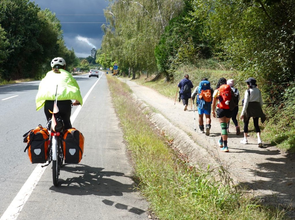 20 km vor Santiago ist richtig was los. Eine Pilgerherberge neben der anderen. Die letzte Station vor der letzten Etappe, in O Pino. Hier muss jeder übernachten. Wir fahren weiter. Einige Pilger kommen uns seltsam vor. Sie tragen nur kleine Tagesrucksäcke, Handtaschen sogar nur Einkaufstüten mit sich. Keine echten Pilger. Es gibt unzählige Camino-Tour- Anbieter. Sie setzen ihre Kunden irgendwo aus und holen sie auf der Strecke mit Bussen wieder ab. Teuer und bequem. Pilgern light. Mit allem wird heute Geld gemacht. Das gleiche gibt es auch für Radfahrer. Mit E-Bike und ohne Gepäck. Wir sind froh, alles aus eigener Kraft zu schaffen.