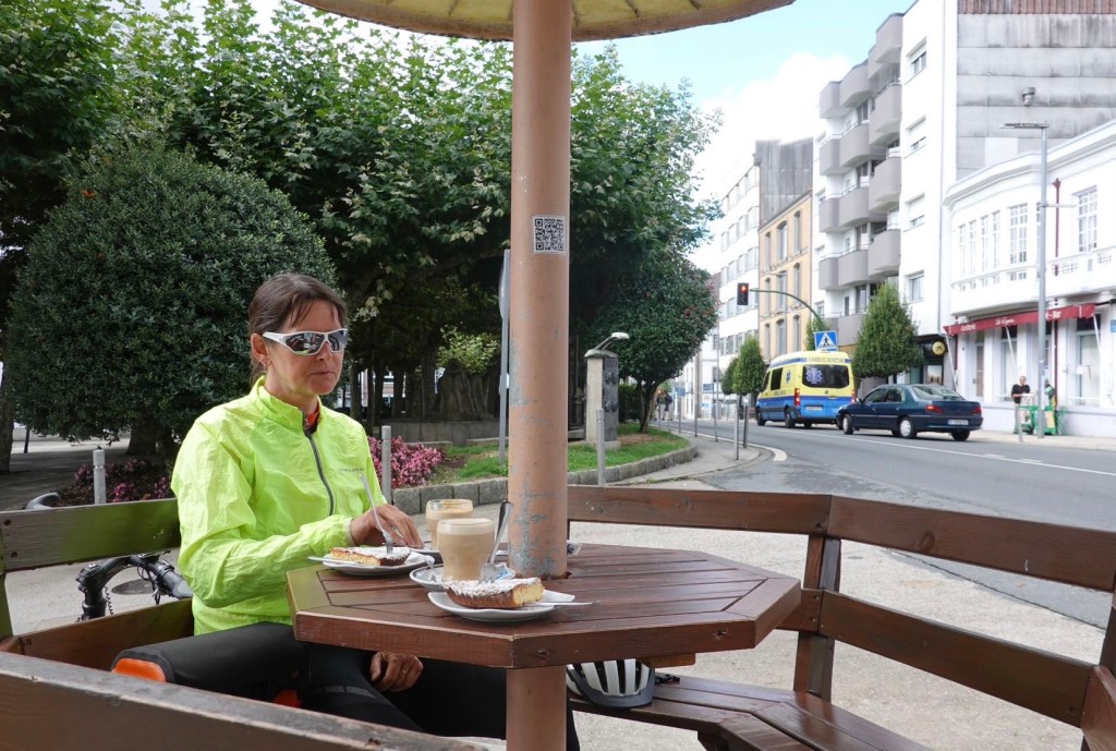 Die Restaurants hier sind sehr touristisch. Wir suchen etwas authentisch Galizisches. Und finden eine kleine Bar mit zwei alten Wirten. Ein Tisch außen ist besetzt. Innen ist alles leer. Wir fragen, ob wir was essen können. Die alte Dame nimmt uns mit in die Küche und zeigt uns, was sie anbieten kann: Galizische Gemüsesuppe, Salat und Tortilla. Wir schauen in die Töpfe und bestellen. Ihre Suppe sei die beste, sagt sie. Wir bekommen ein gesundes, frisches Essen nach Hausmannskost. Und die beiden Alten freuen sich, dass es uns schmeckt und wir fürs weitere Rad fahren gestärkt sind. Wir müssen noch mehr als 100 km fahren.
