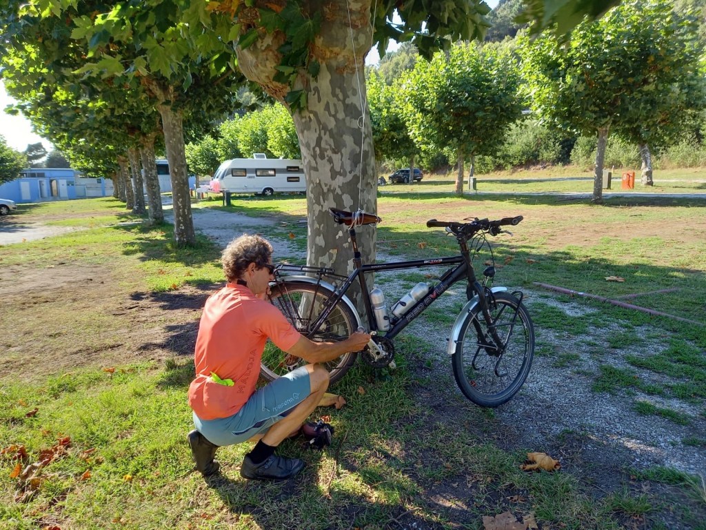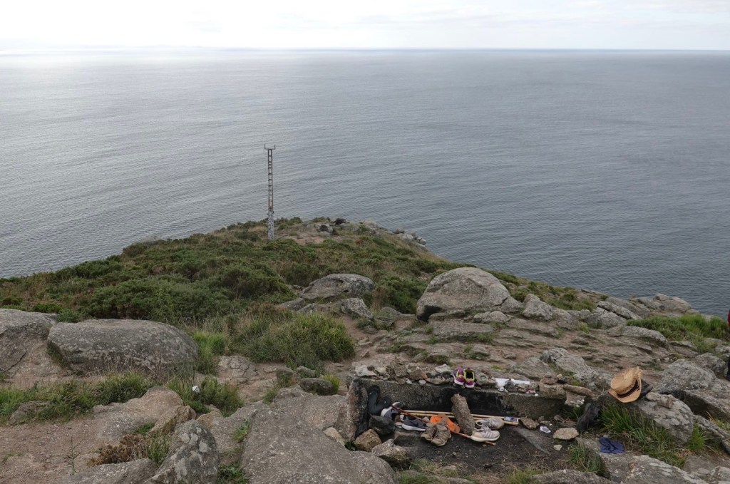 Die spanischen Autofahrer, auch die LKW-Fahrer nehmen viel Rücksicht auf uns. Auch ohne die Hinweisschilder mit 1,5 m Abstand zu Radfahrern, die es sehr oft gibt, fahren fast alle mit weitem Abstand an uns vorbei. Oder sie bremsen ab und warten bis sie überholen können. Jeder hält am Zebrastreifen an. So rücksichtsvolle Autofahrer haben wir noch in keinem Land erlebt. Nach und nach nimmt der Verkehr ab. 11 km vor dem Cap Finisterra finden wir einen Campingplatz mit Meerblick. Das Ende der Welt muss noch auf uns warten. Morgen früh wollen wir dort hoch fahren. Jetzt gehen wir lieber zum Strand. Und ins Meer. Das Wasser ist eiskalt. Lange halten wir es nicht im Wasser aus. Sehr erfrischend. Wir haben das Cap vor Augen. Hin schwimmen ist zu kalt. Lieber fahren wir dann mit dem Rad zum Ende der Welt.