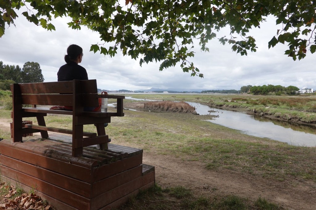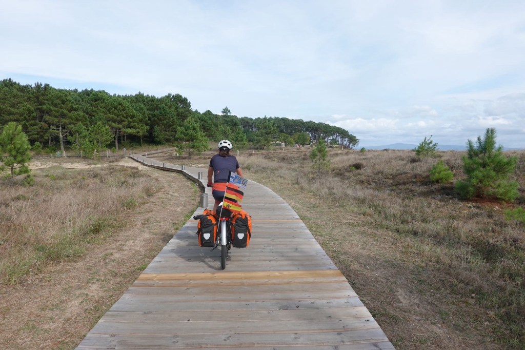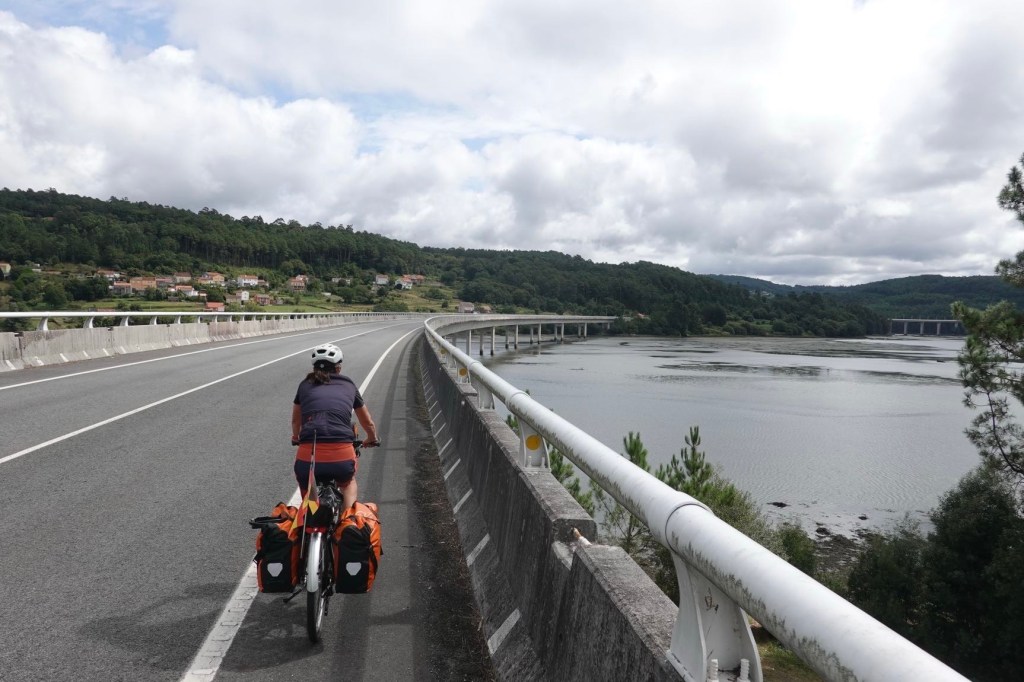Unsere heutige Etappe ist kaum anders als die gestrige. Wir sind auf Umwegen unterwegs. Die Halbinseln sind so groß und die Buchten so tief, dass wir den Punkt, an dem wir vormittags gestartet sind, nachmittags ganz nah vor uns haben. Mit dem Boot ein paar Kilometer. Mit dem Rad um die Bucht herum eine ganze Tagesfahrt. Eine kleine Abkürzung sind Brücken über breite Flusstäler. Ein spanischer Rennradfahrer kommt uns entgegen, hält an und erklärt uns den Weg über abenteuerliche Brücken in unserer Richtung. Ein hilfsbereiter Radfahrer.