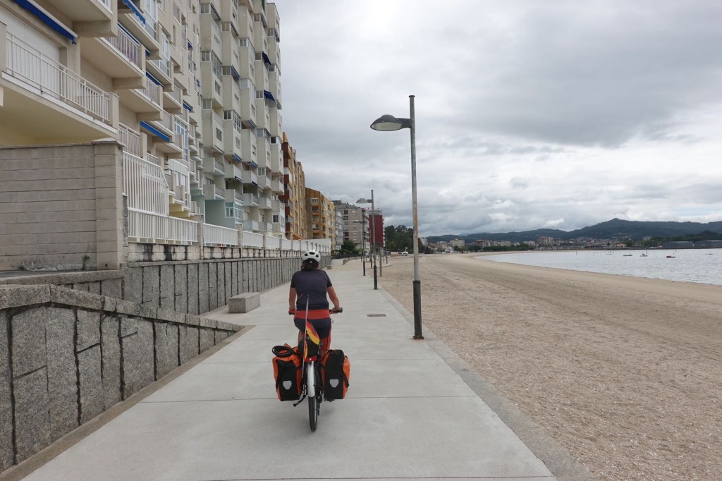 Vom letzten Berg geht es steil hinab nach Ribeira. Dann auf einem Radweg am Meer entlang bis zum Campingplatz. Doch der ist geschlossen. Laut Homepage im Internet sollte er bis zum Wochenende geöffnet sein. Fünf Kilometer weiter ist noch einer. Geöffnet. Doch alle Restaurants am Strand bieten nur noch Lunch. Auch der Supermarkt ist zu. Wir marschieren los. Irgendwo muss es doch noch was zu essen geben. Wir finden ein gehobenes Restaurant. Wir sind die einzigen Gäste und werden sehr nett bedient. Und der Pulpo á feira, eine galizische Spezialität, schmeckt köstlich.