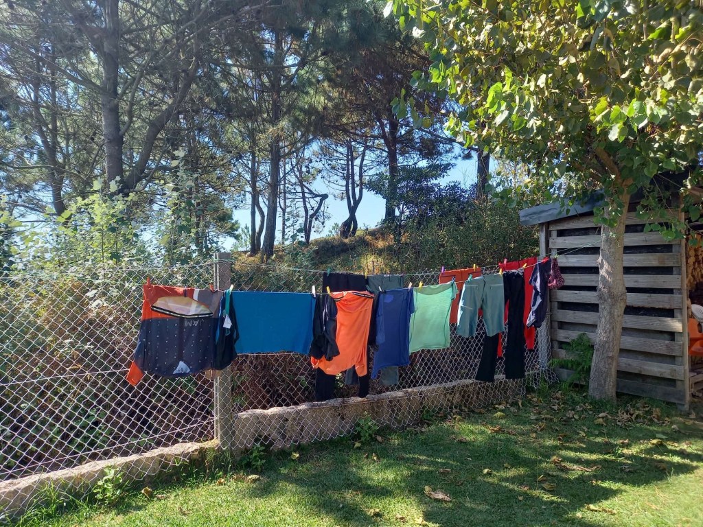 Wir bleiben noch. Es ist ideales Wetter für unsere Wäsche. Sonne und Wind. Und es gibt eine Waschmaschine. Die meisten unserer Kleider haben eine Wäsche dringend notwendig. Wir werfen sie in die Waschmaschine. Im Wind trocknen sie schnell. Währenddessen repariert Klaus sein Rad. Das Ersatzteil hatten wir gestern schon in einem kleinen Radladen gekauft. Dann befreit er unsere Räder von Schmutz und fest gefahrenen Öl. Sabines Schaltung hätte nicht mehr lange funktioniert. Klaus entdeckt eine lose Schraube. Ohne diese ginge nichts mehr. Also ein erfolgreicher Vormittag. Wäsche und Wartung ok. Und alles mit Meerblick. Den wollen wir nach getaner Arbeit noch weiter genießen.