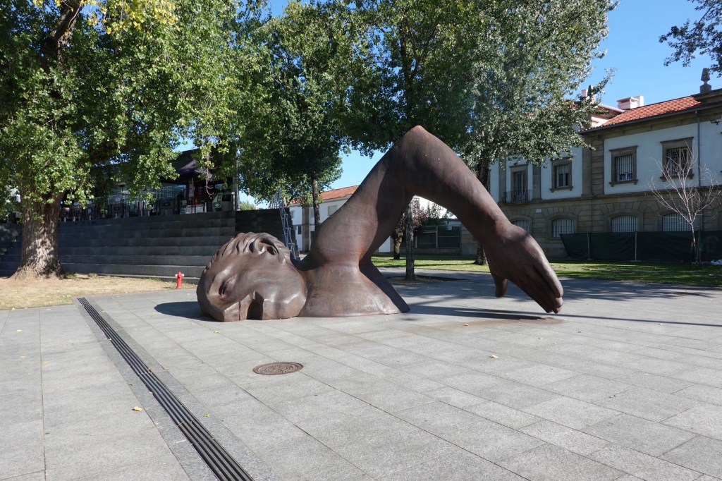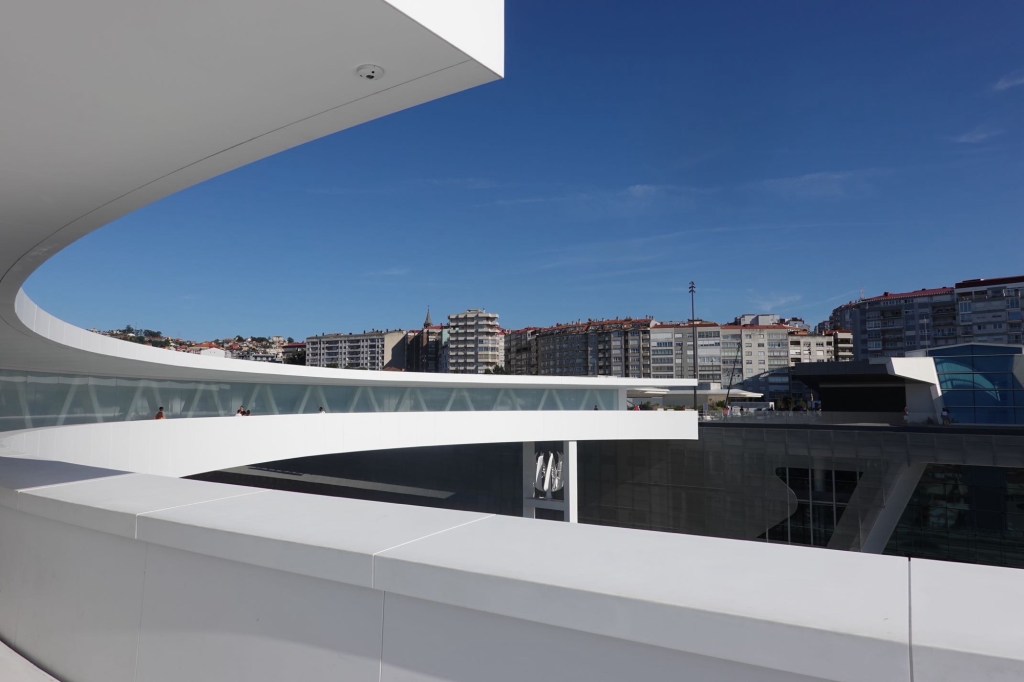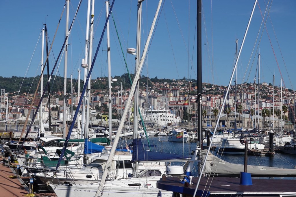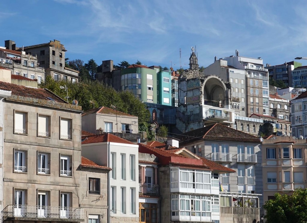 Wir kürzen die Halbinsel ab. Über einen Berg. In Cangas nehmen wir die Fähre nach Vigo. Wir wollen eine neue Gaskartusche für unseren Gaskocher kaufen. Im Decathlon Vigo. Es befindet sich neben dem Bahnhof. Wir stehen mit unseren Räder vor einem imposanten Aufzug. Er bringt uns ca. 20 m höher über die Bahnhofsebene. Auf eine runde Brücke ganz in Weiß. Mit Blick über die Stadt. Ein interessantes Bauwerk zur Erschließung des Bahnhofs und eines Einkaufszentrums. Gebaut von einem internationalen Architekturbüro L35. Leider gibt es kein Gas. Vigo ist eine Stadt mit viel Industrie. Der ersten Industrie, die wir in Galizien sehen.