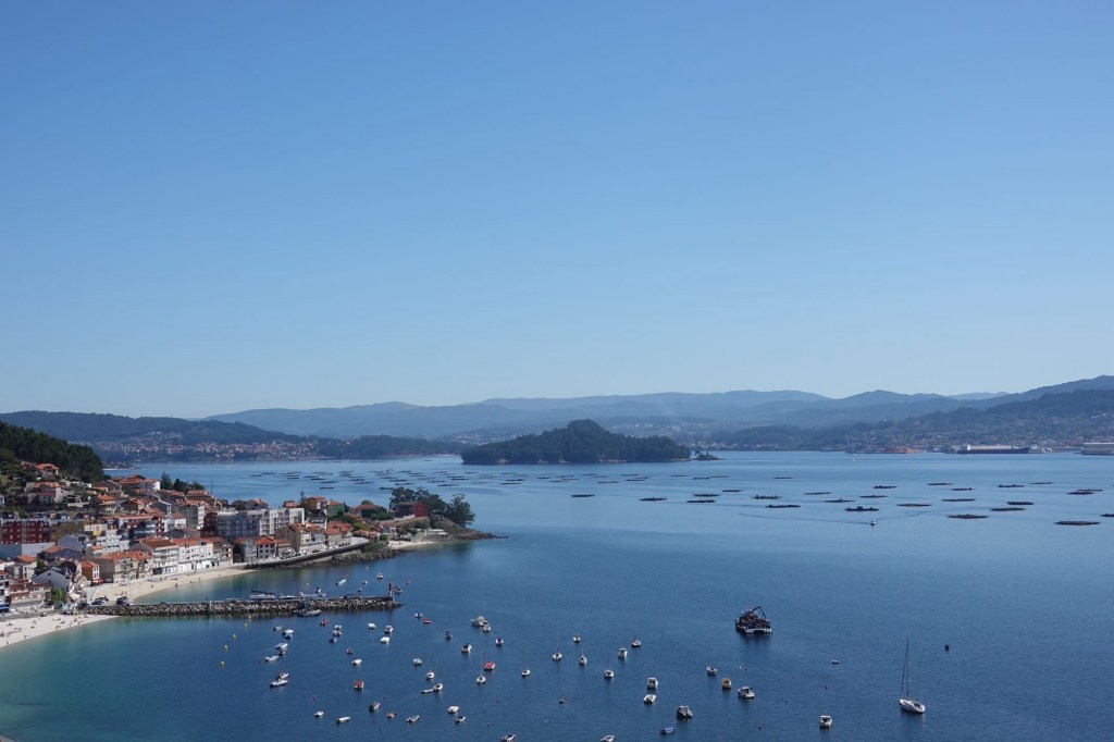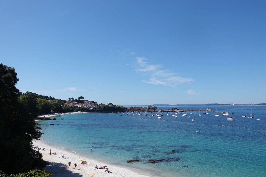 Auf unserer heutigen Tor zeigt sich Galizien dauernd mit einem anderen Gesicht. Wir starten in einer Traumlandschaft mit Klippen und einsamen Sandstränden. Ein paar Kilometer weiter ausgeprägter Tourismus. Hotelburgen, Shoppingstraßen und Strände mit Hunderten Sonnenhungrigen. Gestern waren höchstens 10 Personen an unserem Strand. Jetzt ist auch viel Verkehr auf den Straßen. Ein Badeort reiht sich an den nächsten. Porto Novo, Sanxenxo, Arias, Raxó, wie sie alle heißen. Auf der anderen Seite der Bucht dann ein anderes Bild: Kleine Orte mit vornehmen Villen an Buchten mit weißen Stränden und hellblauem Wasser.