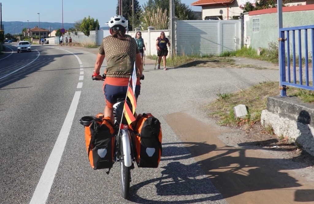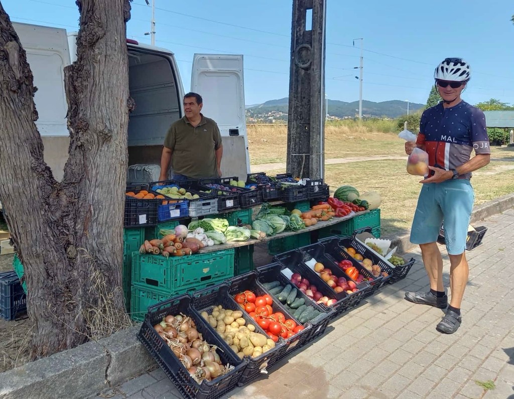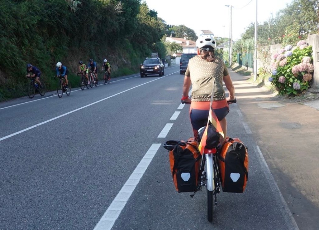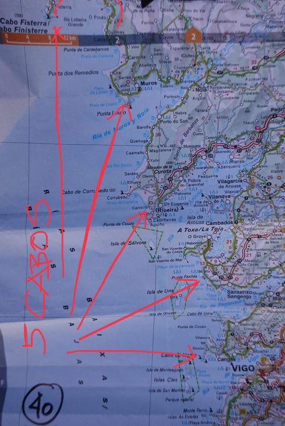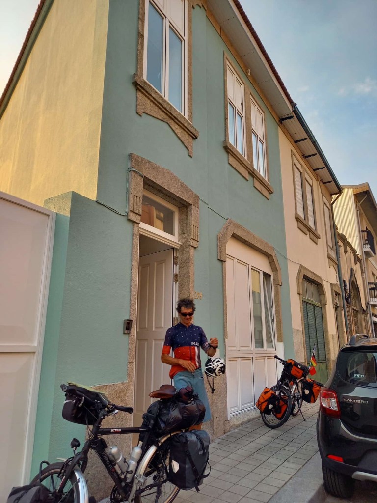 Die erste Halbinsel kürzen wir heute ab. Über einen Pass. Hunderte Rennradfahrer sind unterwegs. Auf dem Ebenen. Am Berg nur wenige. Über den Berg geht es nach Portugal. Zum Grenzfluss Rio Miño. Auf der Brücke machen wir Flaggenwechsel. Dann fahren wir einen schönen Flussradweg. Die kleinen Orte sind gepflegt. Schöne Plätze mit weißen Häusern und Kirchen. Beim Obsthändler an der Straße kaufen wir Obst fürs Frühstück. Er sieht unsere Karte und fragt, ob es in Marokko schön ist. Na klar! Der Radweg endet. Nun testen wir die portugiesische Landstraße. Es gibt auch hier oft Seitenstreifen. Doch das rücksichtsvolle Fahren der spanischen Autofahrer endet hier. Die Portugiesen rasen, fahren viel enger an uns vorbei und geben uns nicht immer die Vorfahrt. Wie zuhause eben. Also immer defensiv fahren und aufpassen.