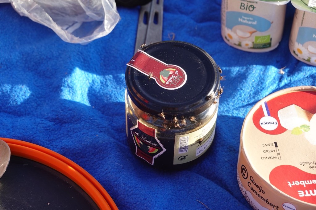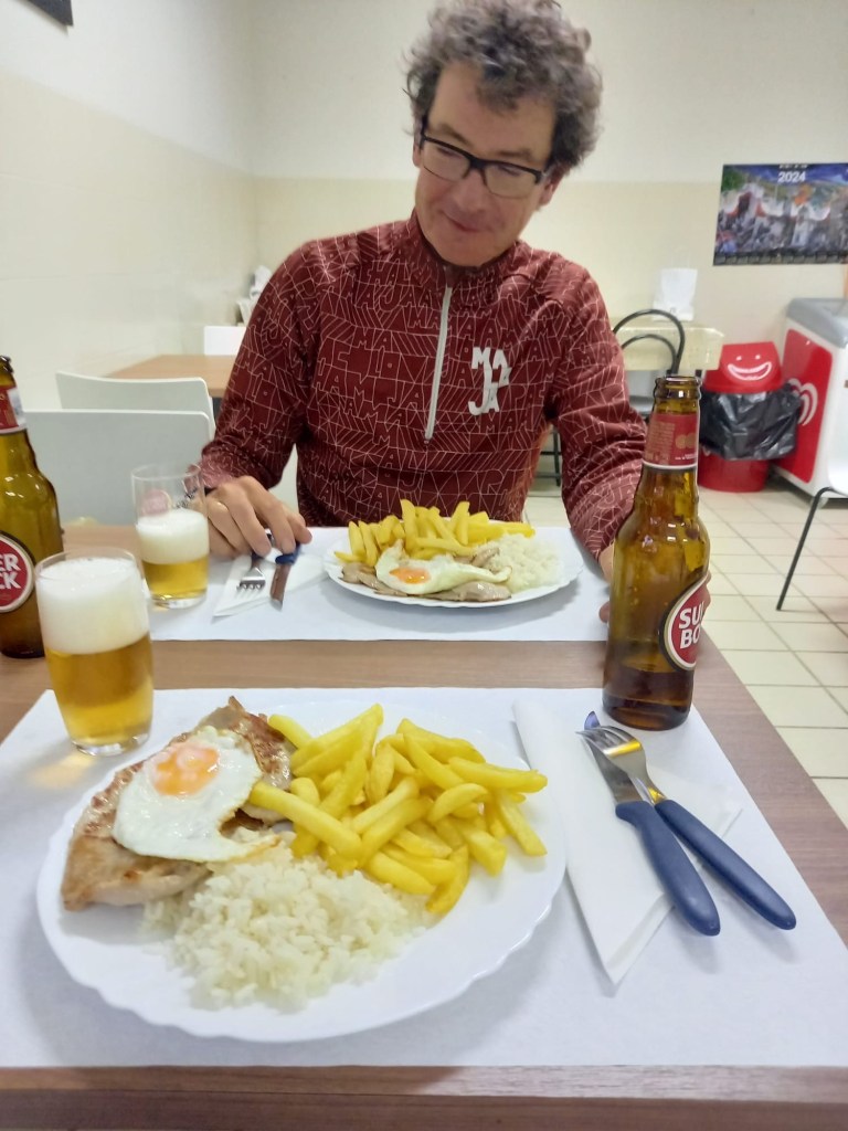 Wir konnten mal wieder nichts zum Abendessen einkaufen, heute ist Sonntag. Die Läden sind nur vormittags geöffnet. Heute ist unser Hochzeitstag. Wir möchten essen gehen. Auf Google-Maps gibt es ein Restaurant in der Nähe. Fragt sich nur: wo? Wir haben keins gesehen. Auf dem Platz gibt es eine Snackbar. Ein nettes altes Ehepaar versorgt die wenigen Gäste. Wir fragen, ob wir was essen können. Die alte Dame zeigt uns ihren Kühlschrank. Ob das für uns in Ordnung ist, will sie wissen. Wir nicken und lassen uns überraschen, was sie daraus macht. Später erfahren wir, dass sie uns ein portugiesisches Standardgericht gekocht hat, das es so in vielen Restaurants gibt – Francheshina. Dünne Schnitzel, Pommes, Reis und Spiegelei sieht für uns eher nach Resteessen aus. Aber ein originelles Essen zum Hochzeitstag. Zu einem besonderen Preis. Inclusive 2 Bier, 2 Wein, 2 Eis und 2 Kaffee zahlen wir gerade mal 22 Euro. Der Campingplatz selbst wäre beinahe der preisgünstigste unserer Tour gewesen. Doch heute ist noch Hochsaison. So zahlen wir ein wenig mehr als der Preis von 9,50 Euro morgen in der Nachsaison. Ein Hochzeitstag ohne Luxus.