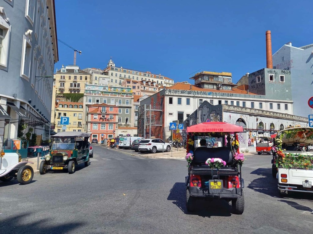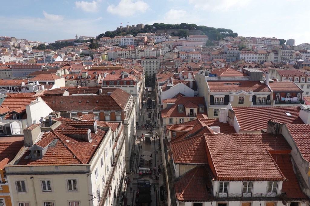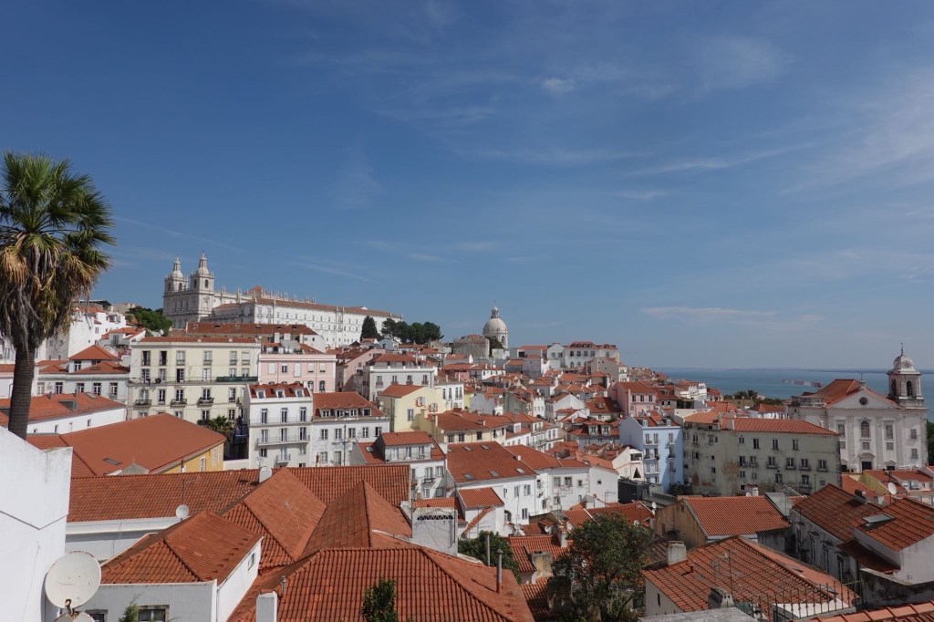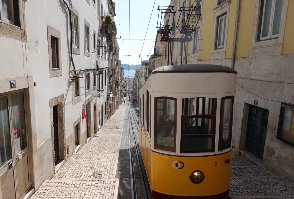 Heute schauen wir uns die Stadt an dem riesigen Fluss Tejo mal an. Von unserem Campingplatz fahren wir mit Bus und Bahn in die Innenstadt. Die Stadtviertel, durch die wir fahren sehen eher ärmlich als weltstädtisch aus. In der historischen Altstadt ist viel los. Überall sind vor den Sehenswürdigkeiten lange Schlangen. Dazu haben wir keine Lust. So laufen wir über steile Gassen zu dem oberen Ende eines Aufzugs, statt hoch zu fahren. Von der Plattform verschaffen wir uns einen Überblick über die City. Lissabon erstreckt sich über mehrere steile Hügel. Das neue Nahverkehrssystem ist nichts besonderes, dafür das historische. Aufzüge, Rolltreppen, Zahnradbahnen und vor allem die alte Tram verbindet die Stadtteile miteinander und bringt ihre Bewohner, heute meist auch Touristen, bequem in die höheren Ebenen. Wir probieren alles mal aus. Die Straßenbahn fährt durch kleinste Gassen, steil und kurvig, manchmal streift sie fast die angrenzenden Hauswände. Sie fährt langsam und ruckelt. Wir fühlen uns etwas an eine Kinderbahn auf der Kirmes erinnert. Wir suchen die Miradoures, die Aussichtspunkte. Der höchste ist auf dem Castelo de São Jorge. Angesichts der langen Schlange vor dem Eintritt verzichten wir darauf. Es gibt noch viele andere.