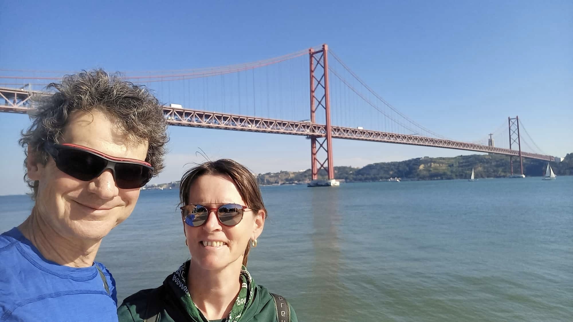 Nach und nach schlendern wir zu den Sehenswürdigkeiten. Sie sind gut erhalten im Gegensatz zu vielen Privathäusern, die allmählich zerfallen. Wie in Porto ziehen die Menschen aus der Altstadt in die Vororte. In den engen Gassen wohnen nur noch die Alten. Oder Touristen. Kultur geht verloren. Trotzdem haben die Gassen mit den gefliesten Häusern ihren Charme bewahrt. Das Ensemble ist eine Besonderheit, die einer Weltstadt würdig ist. Eine Besonderheit erwartet uns auch am Ufer des Tejo: die Ponte 25 de Abril. Eine 2,3 Kilometer lange Hängebrücke aus Stahl. Sie ist weltweit die drittgrößte Brücke mit kombiniertem Straßen- und Bahnverkehr auf zwei Ebenen. Und sie sieht aus wie die Golden-Gate-Bridge. Kein Wunder. Sie wurde vom gleichen Architekten geplant und vom gleichen Bauunternehmen gebaut. Und dann noch mit der gleichen rot-orangen Farbe gestrichen. Sie ist ein Wahrzeichen von Lissabon. Benannt wurde sie nach dem Datum der Revolution 1979, die die Diktatur des Salazar-Regimes ablöste. Vorher hieß sie Ponte Salazar.