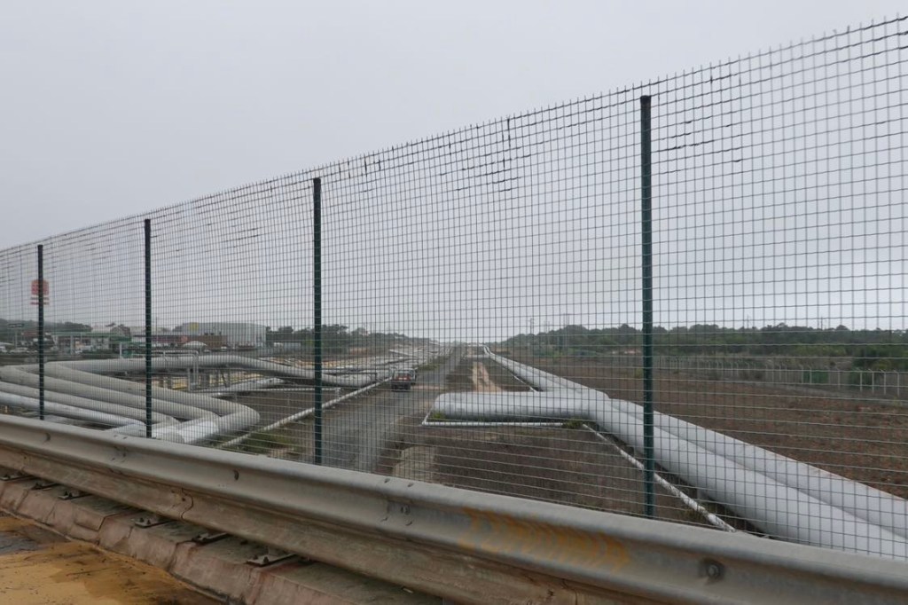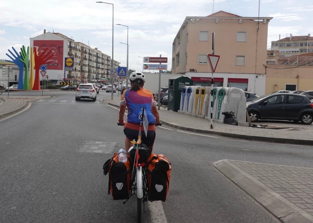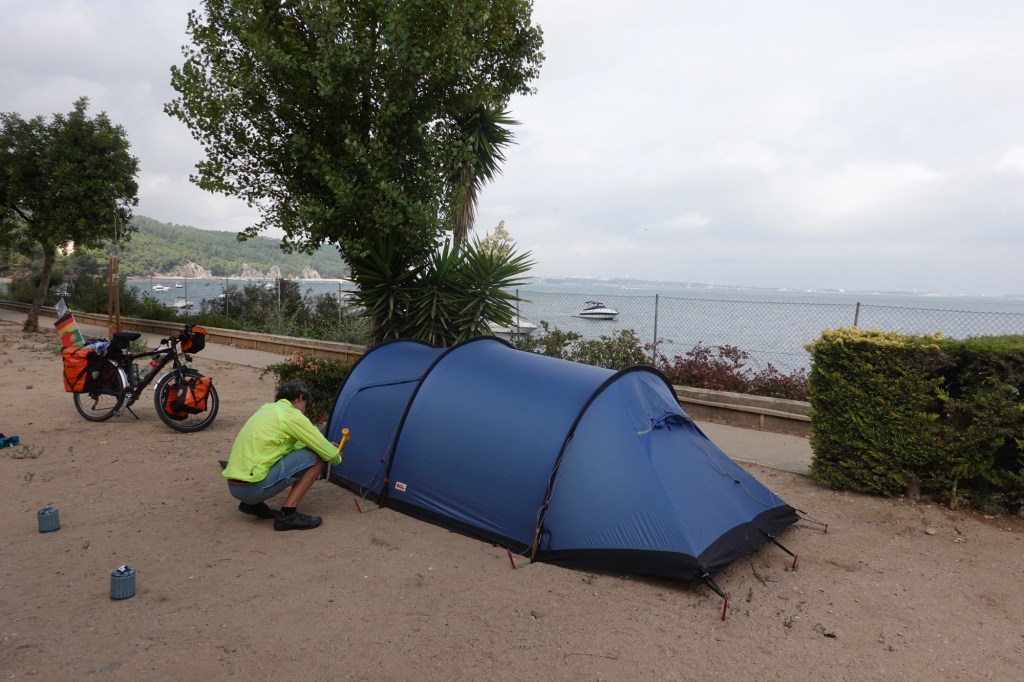 Mit dem Rad raus aus der Millionenstadt zu kommen, ist genauso schwierig wie rein zu fahren. Über Hauptstraßen durch neue Handelsviertel und ältere Wohnviertel mit hässlichen Hochhäusern fahren wir bis Belém. Entlang des Tejo gibt es dort einen neuen Radweg. Vielleicht hat Lissabon dafür seine Auszeichnung bekommen? Wir sehen jetzt doch noch den Torre de Belém. Und nochmal die Hängebrücke. Mit der Fähre fahren wir über den Fluss. Und hoffen, dort schneller aus den städtischen Gebieten herauszukommen. Falsch gedacht. Die drei Millionen Menschen müssen ja irgendwo wohnen. Es ist nicht schön hier. Verwahrloste Wohnsilos, überall Müll am Straßenrand und viele, viele Autos. Nur die letzten 15 Kilometer durch Weinberge, Wald und über Berge vor Setúbal sind angenehm. Hoffentlich wird es südlich von Setúbal besser. Doch heute bleiben wir erst mal nördlich der nächsten großen Stadt. Es fängt an zu regen. Die Bungalows auf dem Campingplatz sind alle vermietet. Dann schlafen wir halt im Zelt. Endlich einmal zum niedrigsten Preis ever: acht Euro kostet die Nacht.