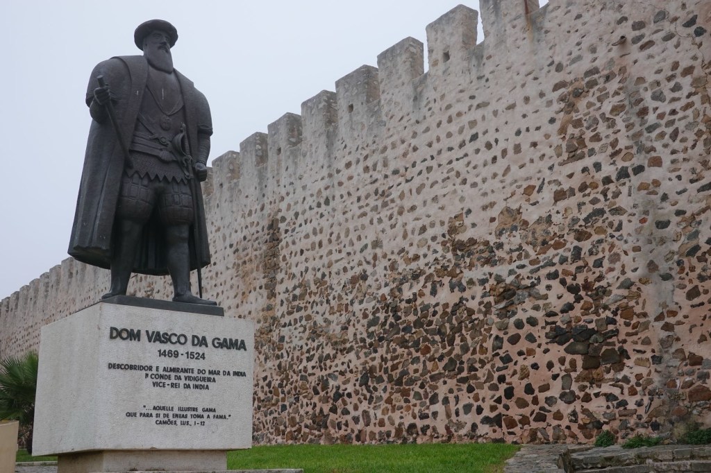 Vor Sines hört es auf. Wir haben ein Zimmer in einem kleinen Hostel gebucht. Ins nasse Zelt wollen wir heute nicht. Sines hat eine kleine historische Altstadt, eine Burg und mehrere Häfen. Einen Fischerhafen, einen Jachthafen und einen Hafen, in dem riesige Tanker Flüssiggas anliefern und in einem LNG-Terminal in eine Pipeline umleiten. Die gigantische Pipeline bringt dann das Gas aus Übersee in den Hafen von Lissabon. Ein Handel über den Atlantik. Sines berühmtester Bürger hat schon im 15. Jahrhundert für Handelsbeziehungen mit anderen Kontinenten gesorgt. Der Seefahrer Vasco da Gama ist hier geboren. Der, der als erster Afrika umsegelt hat und bis Indien gereist ist. Jetzt steht er in Bronze gegossen über dem Strand von Sines. Er wird in Portugal verehrt, die neuere Brücke in Lissabon, die längste Europas, wurde nach ihm benannt. Seine Statue ist wieder getrocknet, wir auch.