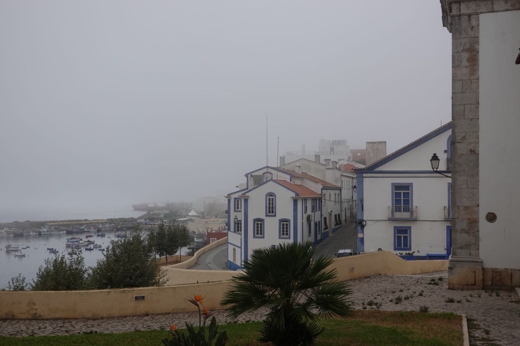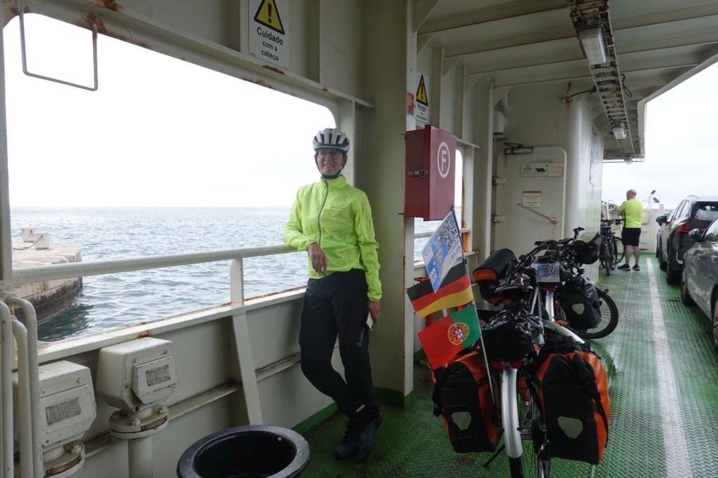Nach dem Frühstück im Zelt nehmen wir die Fähre von Setúbal zur Lagune. Es wird geworben mit einer der schönsten Lagunen der Welt. Im Nebel und Nieselregen sehen wir nicht viel davon. Nur eine nicht sehr reizvolle Stadt, einen Containerhafen, Erdölraffinerien, Zementwerke und Kriegsschiffe eines großen Marinestützpunktes. Auf der anderen Seite Luxusresorts und Baustellen. Vielleicht sind wir auch etwas voreingenommen. Unsere Tochter Sarah hat hier vor Jahren an einem Europacup im Freiwasserschwimmen teilgenommen. Resultat: sie hatte eine so schlimme Magen-Darm-Erkrankung, dass sie Infusionen bekommen musste. Also schwimmen gehen wir hier nicht. Nass werden wir auch so.