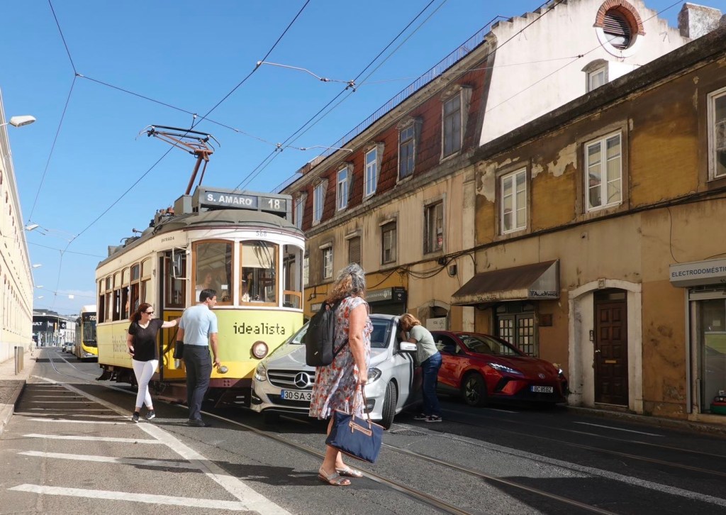 Im Stadtviertel Belém wollen wir uns noch ein zweites Wahrzeichen ansehen. Den Torre de Belém. Das geht leider schief. Ein PKW will die historische Straßenbahn, in der wir sitzen, überholen. Sie tuckert langsam auf ihren Schienen dahin. Plötzlich streift das Auto die Bahn. Wird umgelenkt und die alte gelbe Holzbahn knallt voll in das Auto hinein. Die arme Tramfahrerin ist geschockt. Sie hat nichts falsch gemacht. Den beiden Insassen im Auto ist nichts passiert. Das Auto ist Schrott. Wir steigen aus und wollen mit dem Bus weiter. Doch im Bus stehen wir im Stau. Ein Stau wie in jeder Weltstadt in der Rush Hour. Wir geben auf, gehen einkaufen und fahren zum Campingplatz. Wir haben genug gesehen. Ob Lissabon eine Weltstadt ist, können wir nicht beurteilen. Eine schöne sehenswerte Stadt ist Lisboa auf jeden Fall.