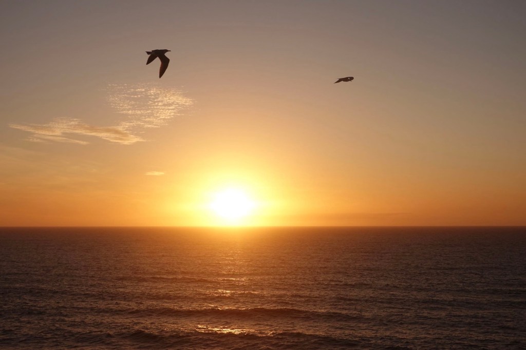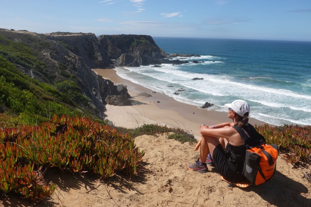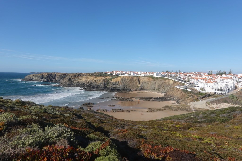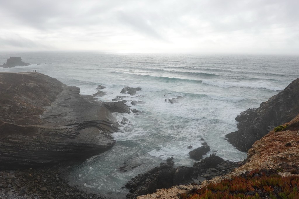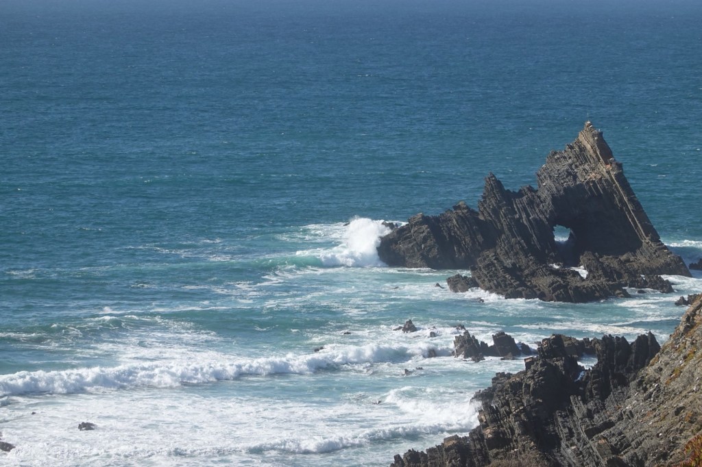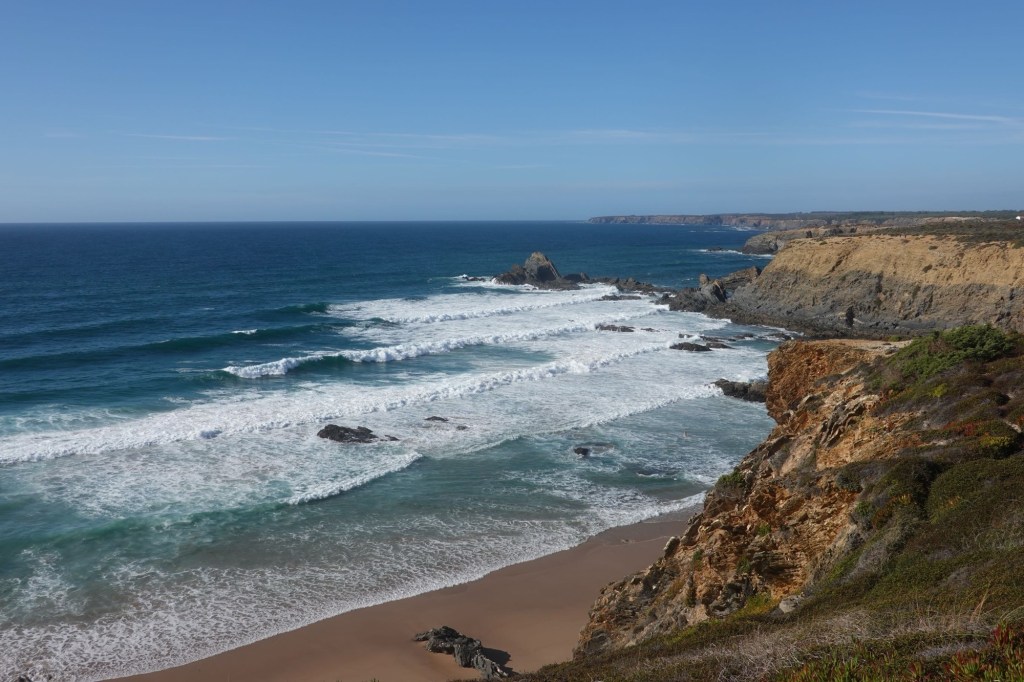 Heute gibt es nur Superlative. Tollstes Wetter, angenehme Temperaturen, schönste Landschaft. Wir bleiben noch einen Tag. Und wandern auf dem Fernwanderweg Ruta Vincente. Er führt (hier) immer an den Klippen entlang. Der Fischerweg. Mit Blicken auf Buchten mit malerischen Stränden. Wir laufen fast sieben Stunden. Unterbrochen durch viele Fotostopps. Wellen, Buchten, Klippen, Felsen, Dünen, Strände… alle hundert Meter ein neues Motiv. Heute sehen wir auch Weißstörche. Sie fliegen ans Kap zu ihren Nestern. Wir baden an einem Strand in den Wellen und trinken einen portugiesischen Kaffee, einen Galão. Ein richtiger Urlaubstag.