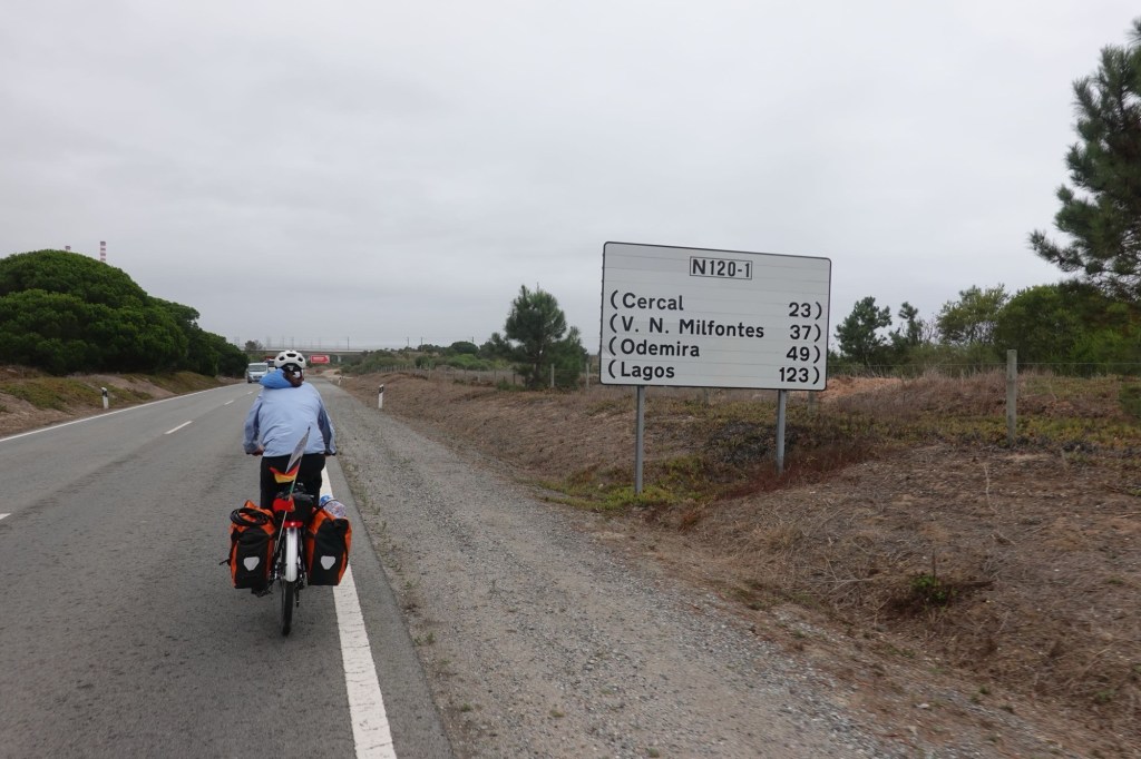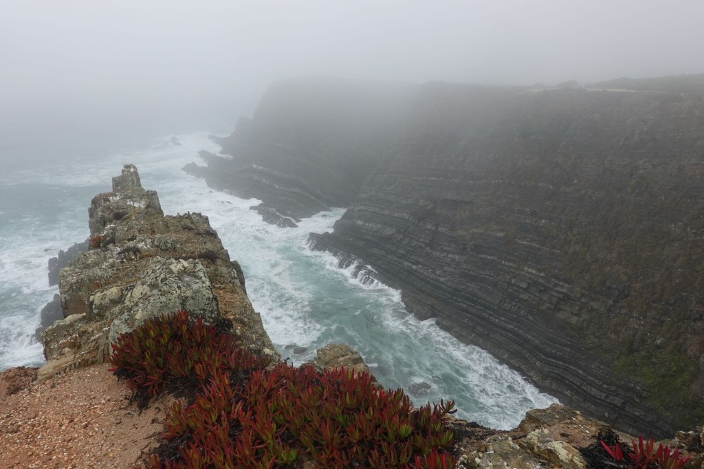 Endlich runter von der Hauptstraße. Wir sind fast alleine auf der Straße zwischen Beerenplantagen. Wie ein Wunder. Und der Tag wendet sich doch noch zum Guten. Am Cabo Sardo, einem Cap mit Leuchtturm, hört es auf zu regnen. Es herrscht aber dichter Nebel. Zwei Niederländer meinen, wir sollten trotzdem zu den Kippen gehen. Es würde sich lohnen. Das tut es dann auch. Das Meer tobt unter uns. Die Klippen haben im Nebel etwas mystisches. Leider sehen wir keine der Weißstörche, die hier in den Klippen nisten. Die letzten 15 Kilometer sind dann auch entspannend. Und unser Zielort Zambujeira do Mar ist ein malerischer kleiner Ort mit weißen Häusern und einer grandiosen Aussicht. Der Campingplatz gilt als der sauberste von ganz Portugal. Ist er auch. Und er bietet einfach alles. Viele Camper aus dem deutschsprachigen Raum sind hier. Wir stellen unser Zelt auf und suchen ein Fischrestaurant. Alle Touristenlokale lassen wir sein. Wir essen in der kleinsten Bar. Fast nur Einheimische sind hier Gäste.