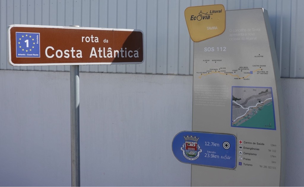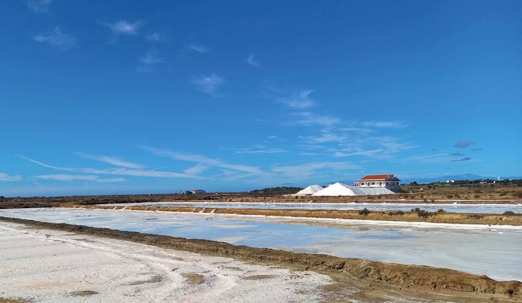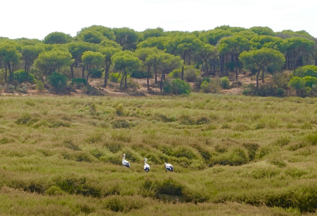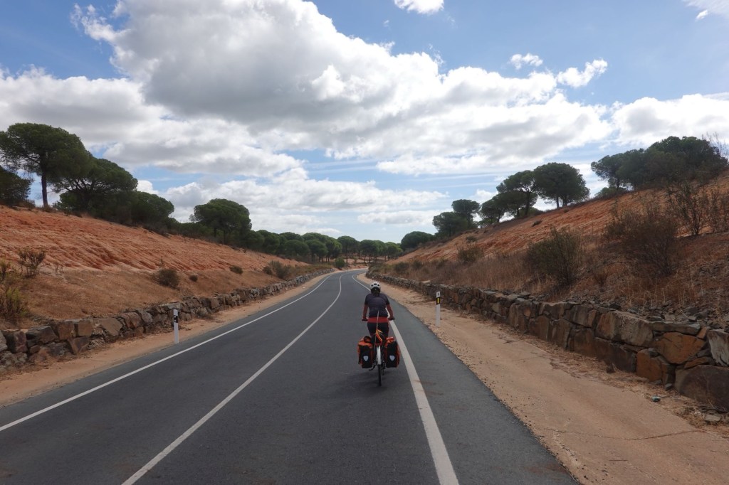 Heute wollen wir fast ausschließlich EuroVelo 1 fahren. Es wird ein fast kompletter Graveltag. Von Olhão bis Ayamonte geht es über unbefestigte Wege durchs Marschland. Es ist Ebbe und die Wasserbecken in den Sümpfen sind leer. Tausende von Krebsen tummeln sich dort. Wenn sie uns kommen hören, verschwinden sie blitzschnell in ihren Löchern. Lautlos. Wir wissen aber jetzt, was Flusskrebse mit Marschland zu tun haben. Eines unserer Lieblingsbücher ist nach ihnen benannt. Es spielt auch in einem Marschland und heißt: Der Gesang der Flusskrebse. Unsere hier singen nicht. Die Sumpfgebiete entlang der Küste sind wahre Vogelparadiese. Wir sehen Flamingos und viele andere langbeinige Vögel, die vom Getier im Schlamm leben. Ab und an ist der Weg kurz unbefahrbar. Aber nur an wenigen Stellen. Ansonsten ist er sogar ausgeschildert und einfach nur schön.