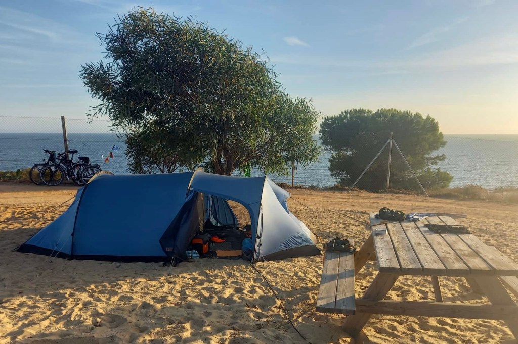 Wir kommen nach Huelva, einer Industriestadt. Einer sehr gepflegten Stadt. Promenaden und Spazierwege entlang des Flusses, tausende Palmen, blühende Pflanzen…und natürlich Radwege. Bis in die Industriegebiete und Hafenanlagen. Wir machen eine Pause um unsere Brötchen zu essen, die Klaus jeden Morgen belegt. So haben wir immer eine Zwischenmahlzeit. Wir wissen ja nie, wo es was zu kaufen gibt. Außerdem machen viele Läden in Spanien von 14 bis 17 Uhr Siesta. Wir treffen einen Radfahrer aus Frankfurt. Bernd ist mit seinem vollbepackten MTB-Fully Off-Road unterwegs.Wir reden über unsere Touren und Ziele. Spontan spendet er für unser Abdou-Projekt. Vielen lieben Dank für diese Großzügigkeit. Eine echt nette Mittagspause. Wir fahren weiter. Stadtauswärts gibt es 15 km lang nur noch Erdölraffinerien und Flüssiggasterminals. Trotzdem gut zu fahren. Unser Campingplatz liegt wieder zwischen Pinien und Meer. Heute hat unser Zelt Meerblick.