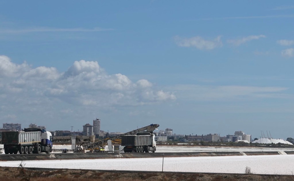 In Spanien macht Rad fahren wieder Spaß. Die größeren Straßen haben Seitenstreifen. Trotzdem fahren alle Autofahrer mit großem Abstand an uns vorbei. In engen Gassen von Ortschaften drängelt keiner hinter uns. Geduldig wird gewartet. Und dann gibt es durchgehende Radwege. Keine Fragmente von einem Kilometer und dann Ende. Wir müssen wieder über einen Fluss, den Odiel, mitten im Marschland. Ein Becken von mehreren Kilometer Breite. Nur an einer Stelle sind zwei Brücken. Eine auch für Radfahrer mit eigener Fahrspur. Hingeleitet werden wir auf einer Rota Verdes, einem Radweg zuerst entlang der Autobahn, dann durch Sümpfe und Salzbecken. Die Brücke ist interessant. Sie singt. Im Geländer bilden sich im Wind verschiedene Töne wie in Orgelpfeifen. Die Radspur wird von vielen Radfahrern benutzt. Sogar eine ganze Schulklasse ist unterwegs. In Spanien wird Rad gefahren. Anders als in Portugal.