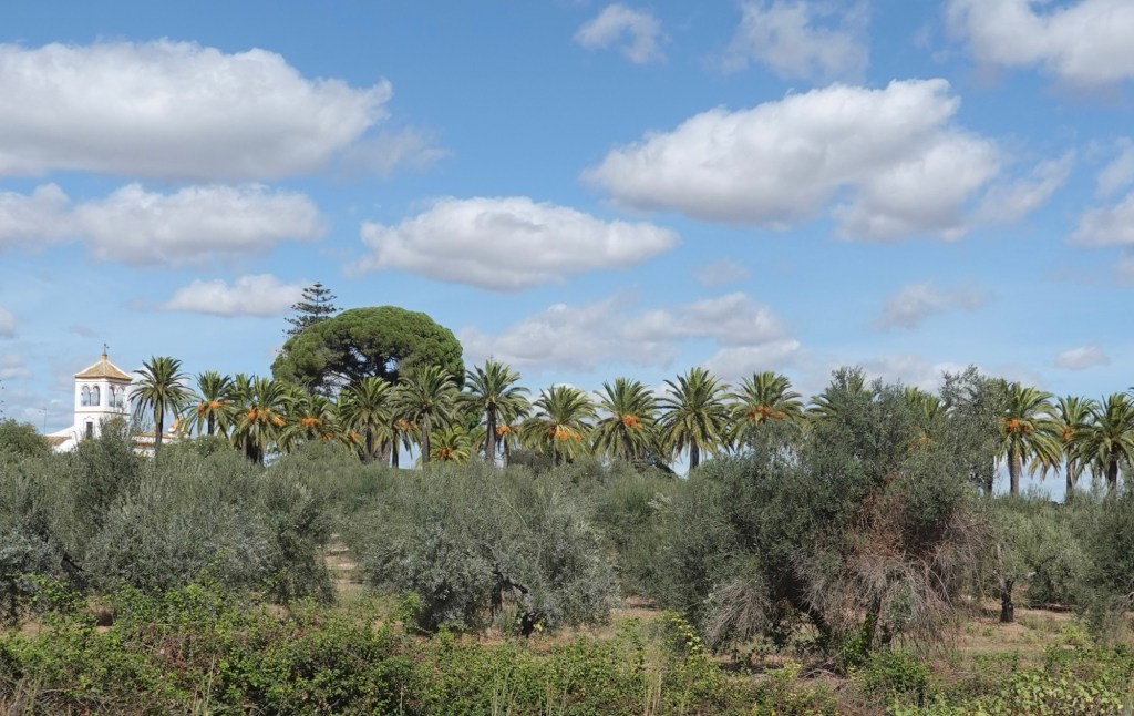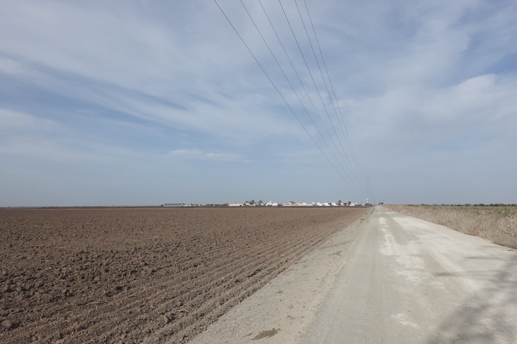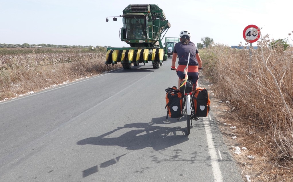 Die Fahrt beginnt vielversprechend. Wie gestern fahren wir auf einsamer Straße durch die Pinienwälder des Naturparks. Einige Radfahrer sind hier am Sonntag unterwegs. Dann ist Schluss. Wir erreichen die Schwemmlandebene des Guadalquivir. Jetzt im Oktober ist sie ausgetrocknet. Nur in Kanälen aus Beton fließt noch Wasser. Wasser für die Landwirtschaft. Für Reis- und Baumwollanbau. Zwei landwirtschaftliche Produkte mit extrem hohen Wasserverbrauch. Für die Produktion von einem Baumwoll-T-Shirt sind bis zu 2000 Litern Wasser notwendig. Sieben bis neun Kilogramm CO2 werden ausgestoßen und jede Menge Pestizide gebraucht. Keine ökologische Landwirtschaft. Und wir fahren den ganzen Tag mitten durch. Einzige Abwechslung ist die Fahrt mit der Fähre über den Guadalquivir. Sie dauert nur einige Minuten. Dann wieder Reis und Baumwolle. Manche Felder sind kilometerlang. Sabine misst sie mit ihrem Tacho ab. Die Ernte ist in vollem Gange. Auch heute am Sonntag. Die riesigen Baumwollpflückmaschinen wirbeln zusätzlich Staub auf. Es ist heiß, staubig und öde. Dann noch Gravel. Die wenigen Dörfer in den Plantagen sind trostlose Orte.