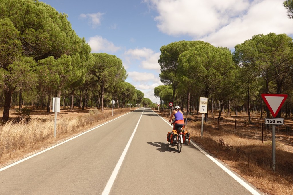 Es geht nach Norden. Über Straßen ohne Autos, mal asphaltiert, mal Gravel. Durch wunderschöne Pinienwälder des Naturparks. Wir genießen die Fahrt. Lassen auch mal unsere Drohne fliegen und haben sogar einen Campingplatz im Wald kurz vor Sevilla gefunden. Alles gut. Nicht ganz. Eine neue Begegnung mit Insekten jagt uns kurz einen Schrecken ein. Wir fahren bergab und plötzlich mitten durch einen Bienenschwarm. Einige berühren uns, stechen aber nicht. Dann sind wir durch. Das ist nochmal gut gegangen. Sabine ist Bienenallergikerin. Dann haben wir vorm Supermarkt auch noch unseren ersten Platten. Nach über 4000 km. Unser Zeltnachbar ist ein netter älterer Herr aus den Niederlanden. Er ist mit seinem Wohnmobil selbst nach Marokko unterwegs. Er begrüßt uns mit einem Willkommensgetränk. Unser Umweg war heute eine schöne Radtour. Eventuell schöner als 30 km Strand.
