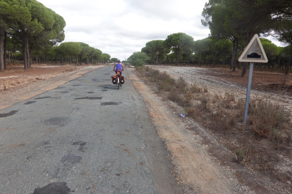 Geplant ist eine Strecke, die 30 Kilometer am Strand entlang führt. Bis zur breiten Mündung des Guadalquivir in den atlantischen Ozean. Dort gibt es eine kleine Fähre. Eine Straße gibt es nicht. Nördlich des Strandes ist das Naturschutzgebiet Coto de Doñana und entlang des fünftgrößten Flusses Spaniens eine riesengroße Schwemmlandebene. Die erste Brücke gibt es in Sevilla. 80 km entfernt. Die Fahrt am Strand ist als Radweg ausgeschildert. Doch sie hat ihre Tücken. Befahrbar ist der Strand nur zwei Stunden vor bis zwei Stunden nach dem Tiefstand der Ebbe. Dann ist der Sand zu weich. Schafft man es in der Zeit nicht, könnte man auch nicht übernachten und die nächste Ebbe nutzen. Der Naturpark muss abends verlassen werden. Es wird mit Fahrzeugen am Strand kontrolliert. Die Strafe beträgt 600 Euro. Wir informieren uns über die Tide-Zeiten. Sie passen nicht. Wir müssten früh morgens dort starten. Doch bis zum Start sind es noch 30 km und übernachten können wir auch nicht. Es gibt keinen Campingplatz, nur Golfresorts. Wir sind uns nicht sicher, ob der Sand mit unseren schweren Rädern mit Gepäck überhaupt fahrbar ist. Was tun? Wir entscheiden uns für einen großen Umweg. Bis fast nach Sevilla. Nicht bis zur Brücke aber bis zu einer Fähre über den Guadalquivir. Das kostet einen weiteren Reservetag. Egal. Irgendwie müssen wir ja weiter.