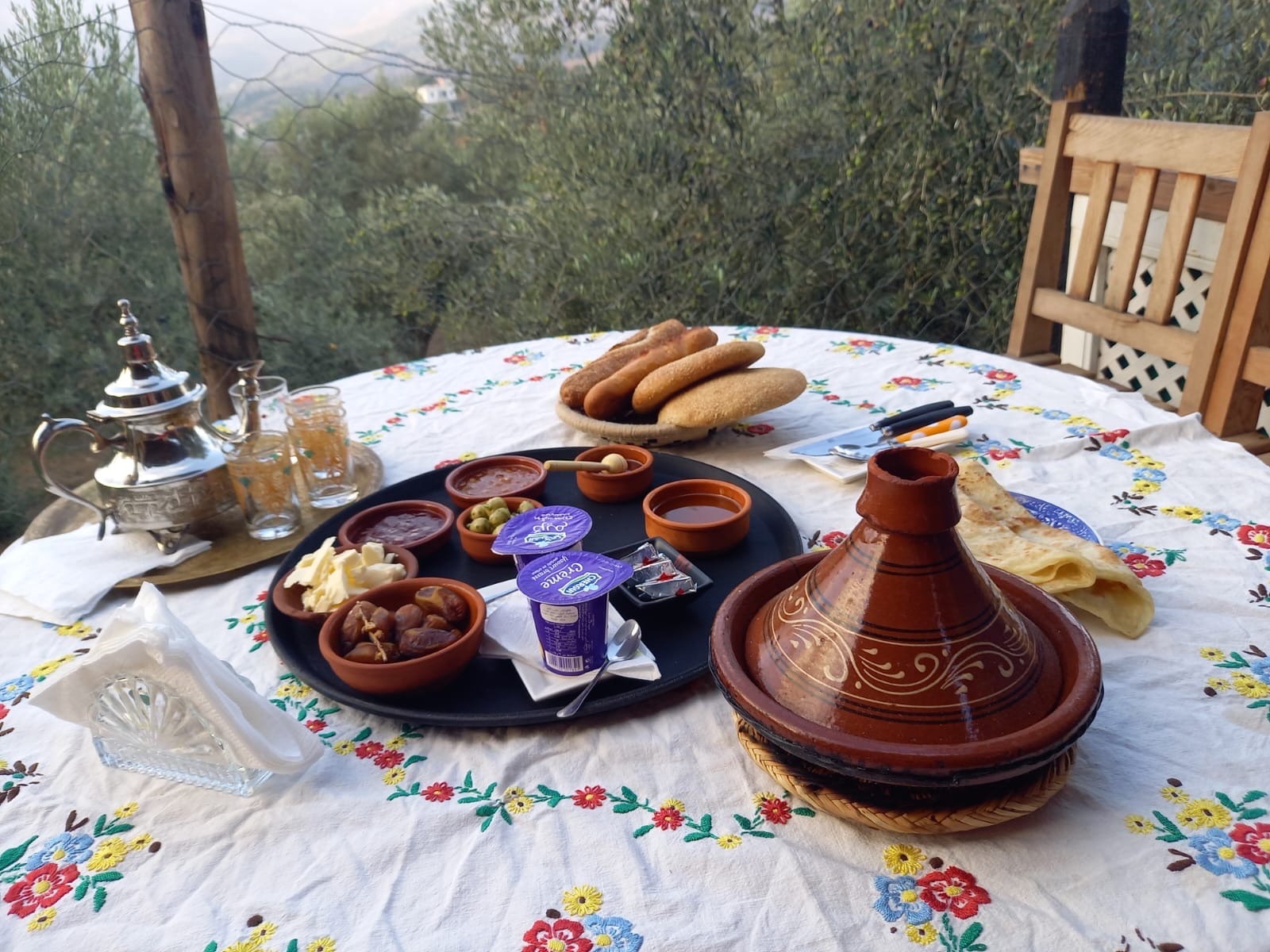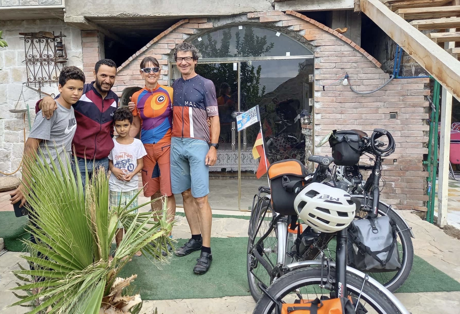 Ein typisches Berberfrühstück serviert uns Houssine am Morgen in seinem Garten. Er serviert, seine Frau bereitet alles zu. Es ist nicht üblich, dass die Frauen Kontakt zu den Gästen haben. Schade, Sabine hätte sich gerne mal mit der hübschen Frau des Hauses unterhalten. Schon abends war sie nur in der Küche und hat beim Kochen vor sich her gesummt. Die Kinder, zwei Jungs, reden mit uns. Youssef, der Ältere lernt in der Schule Französisch und Englisch. Er hat Freude daran, für seinen Vater zu übersetzen. Nach dem Frühstück machen wir noch ein Abschiedsfoto. Die schweren Taschen fährt uns ein Onkel mit dem Pick-Up die steile Rampe bis zum Feldweg hoch. Wir haben auch ohne Gepäck Probleme, die Räder ohne auszurutschen hoch zu schieben. 25% hat die 50 m lange Rampe bestimmt.