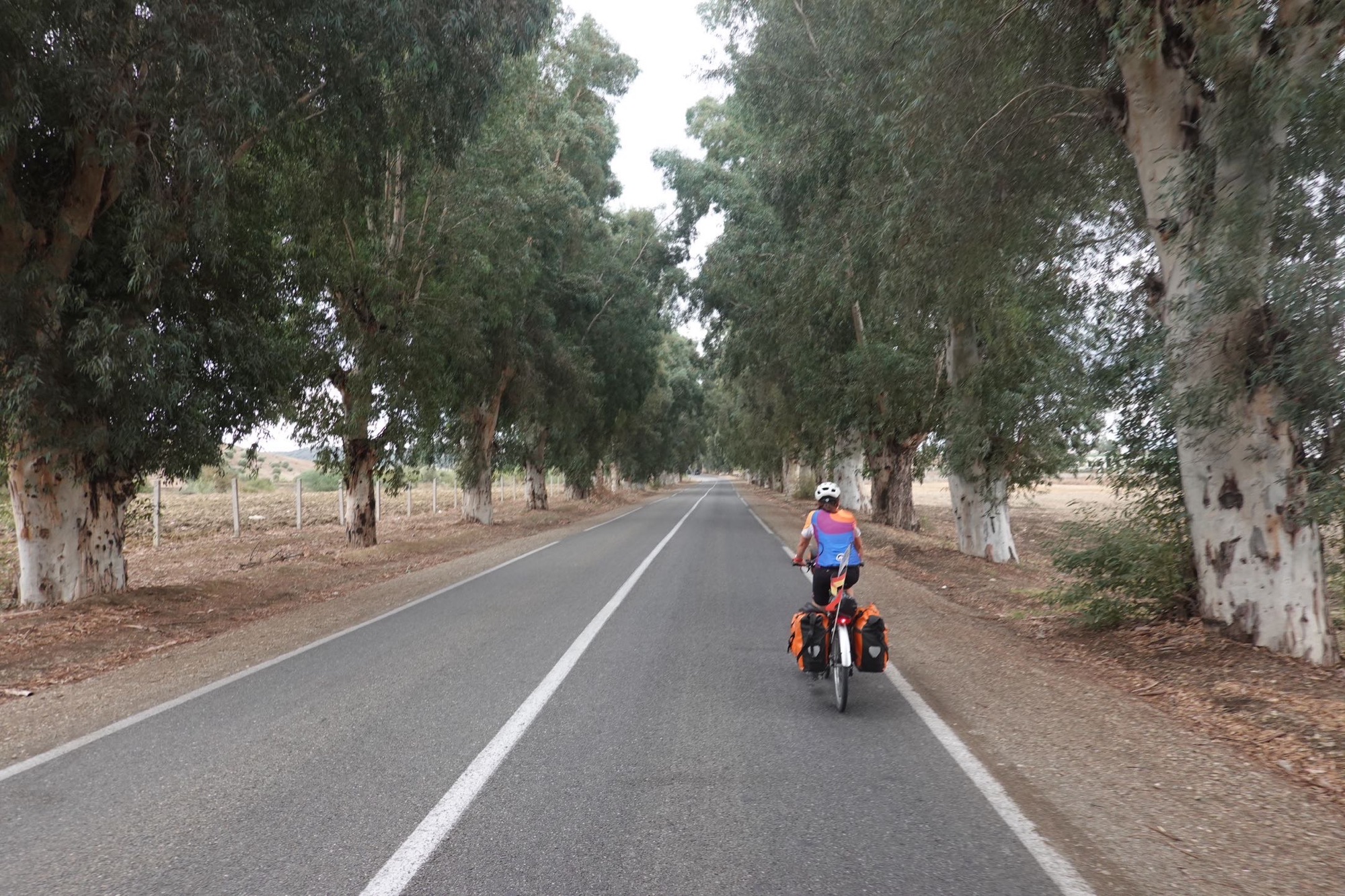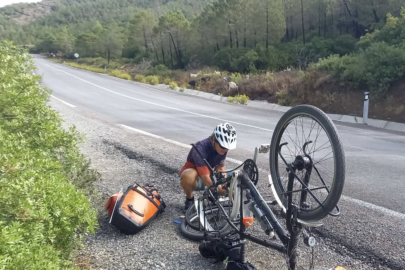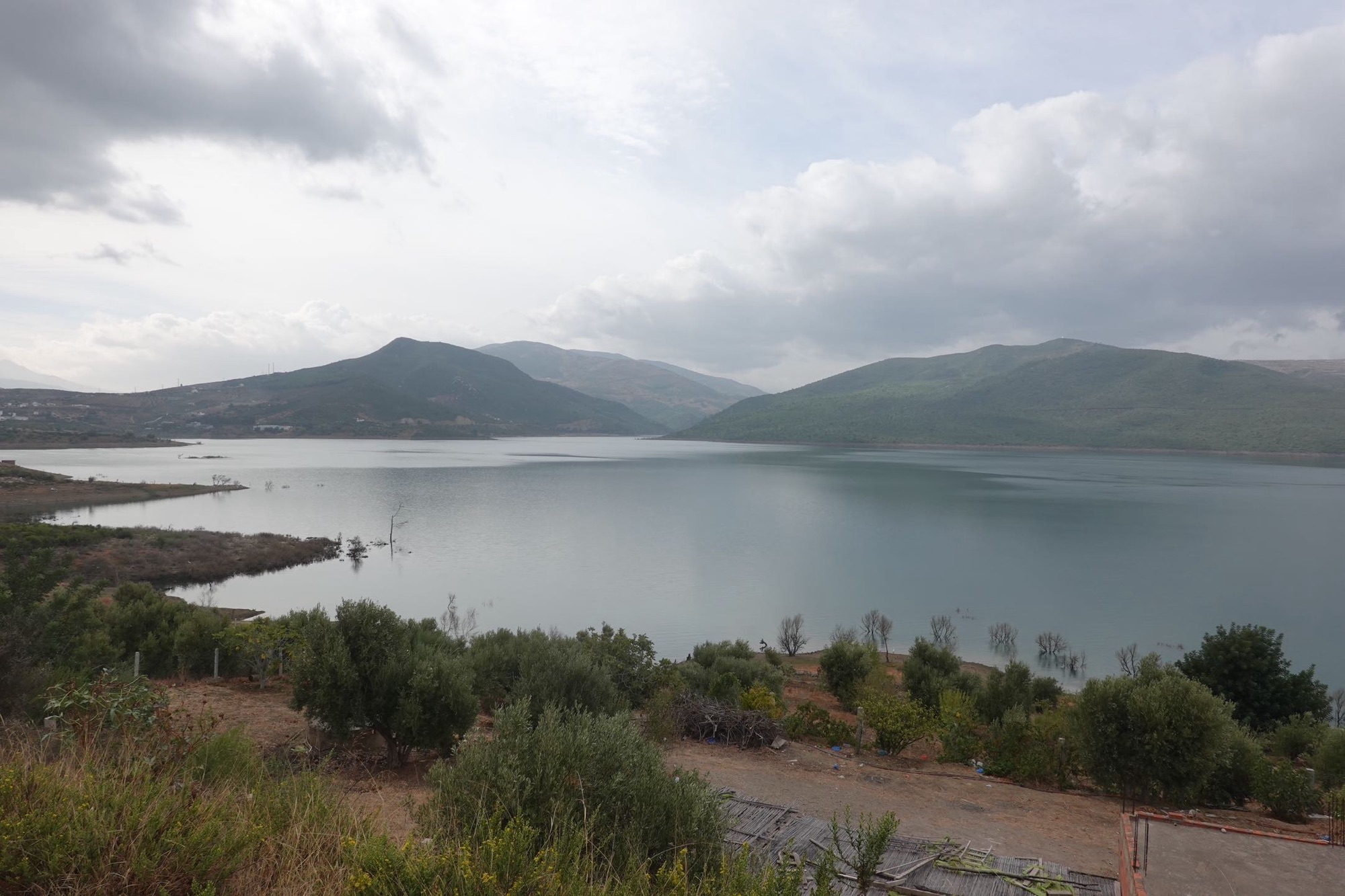 Sabine wird nachts immer wieder von Magenkrämpfen geweckt. Ein Marokko-Problem. Irgendwann erwischt es jeden. Hoffentlich wird es nicht schlimmer. Morgen und übermorgen haben wir lange Strecken und die Unterkünfte sind schon gebucht. Beim Frühstück hat sie keinen Appetit. Es ist auch nichts besonderes in dem Café, in dem hunderte Wespen auf dem Gebäck sitzen. Wir fahren los. Bergab mit viel Aussicht auf die grünen Berge. Unsere Route heute ist sehr schön. Und wenig befahren. Vor allem am Anfang. Wir freuen uns über die schöne Radfahrstraße und dann hat Sabine einen Platten. Klaus sucht das Leck. Zwei Hirten und 20 Ziegen schauen zu. Ein kleiner Stahlstift steckt im Mantel. Da nützt auch ein Schwalbe Marathon unplattbar nichts. Wir sputen uns. Für nachmittags ist Gewitter gemeldet.