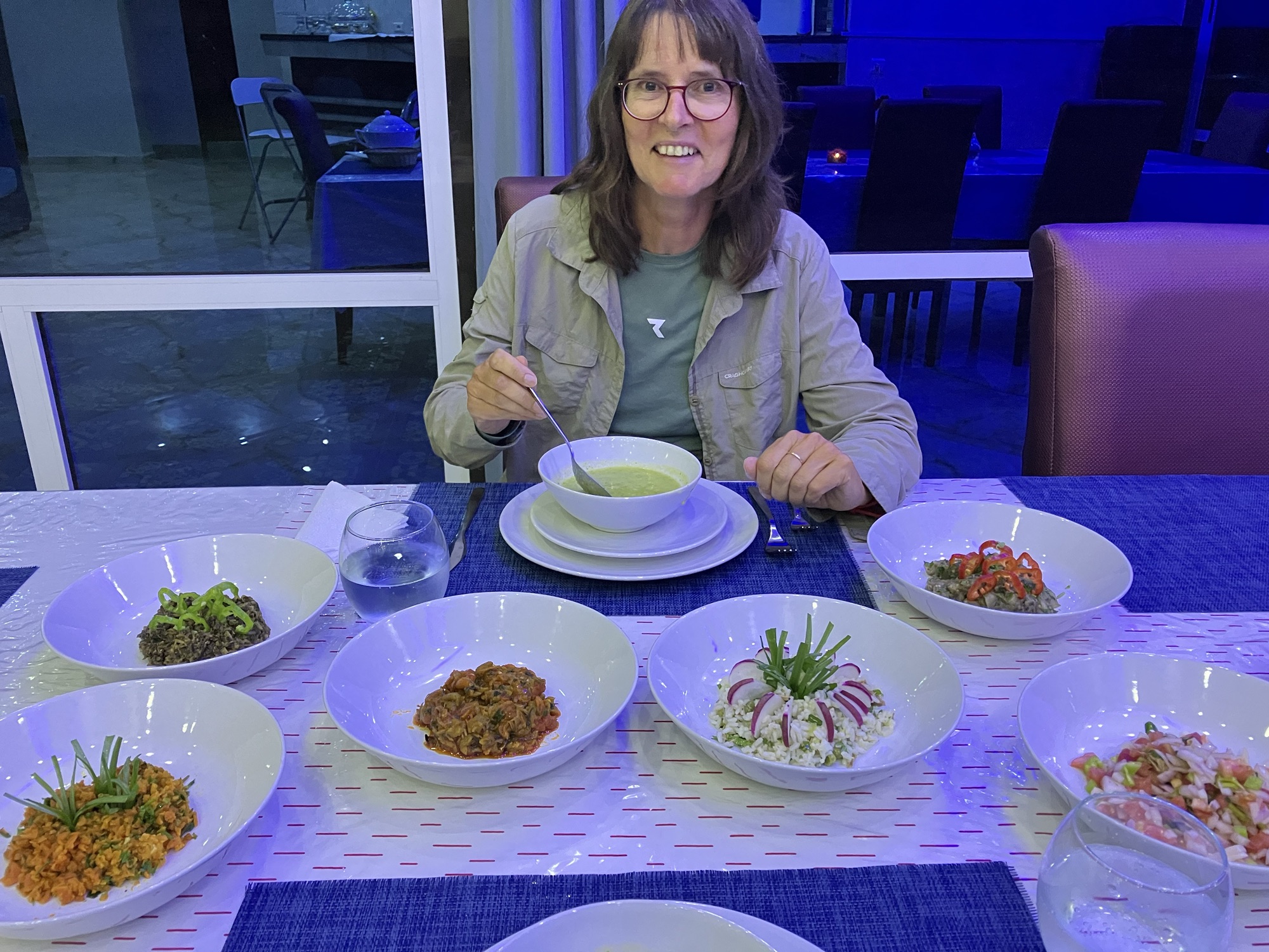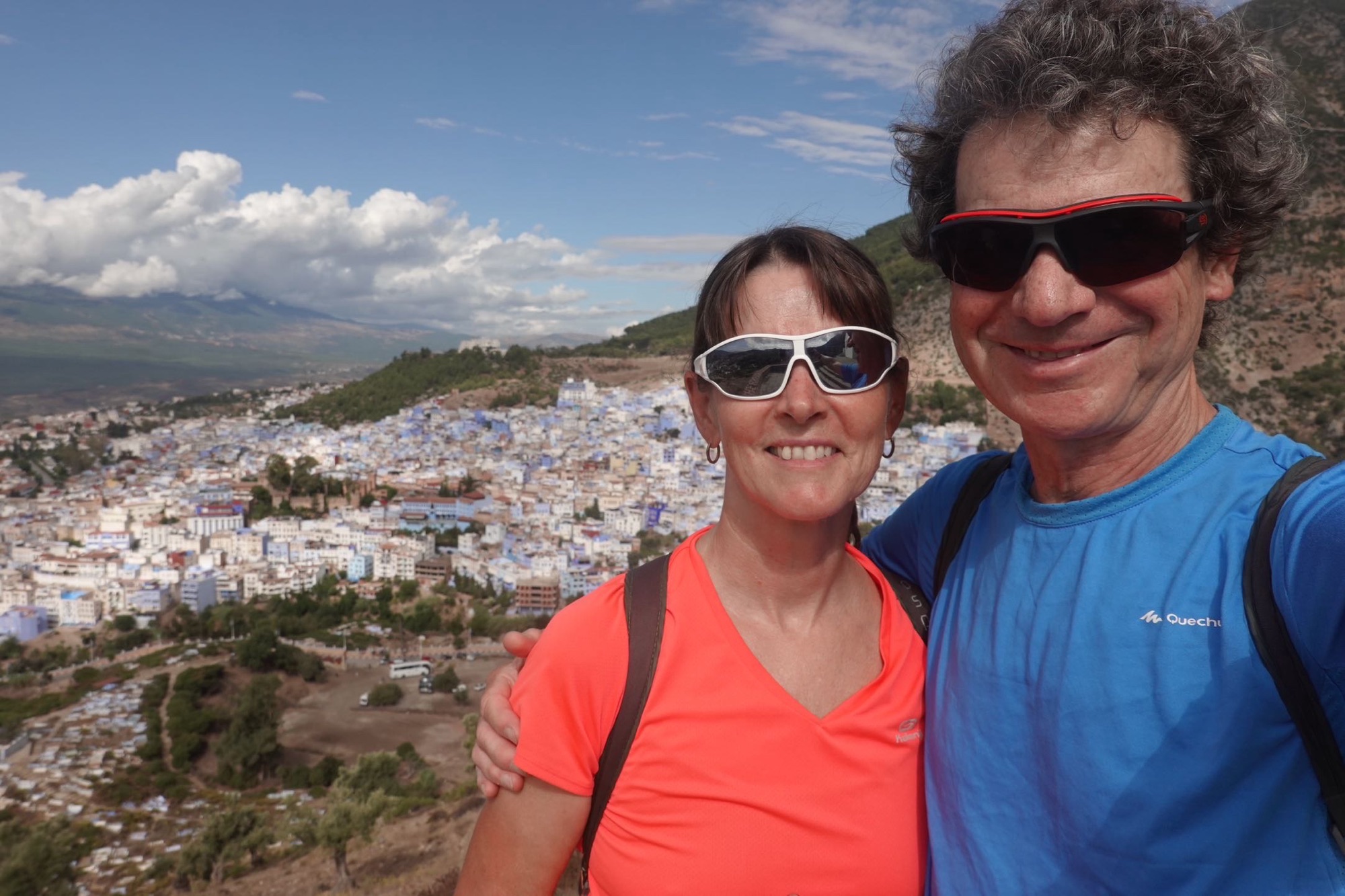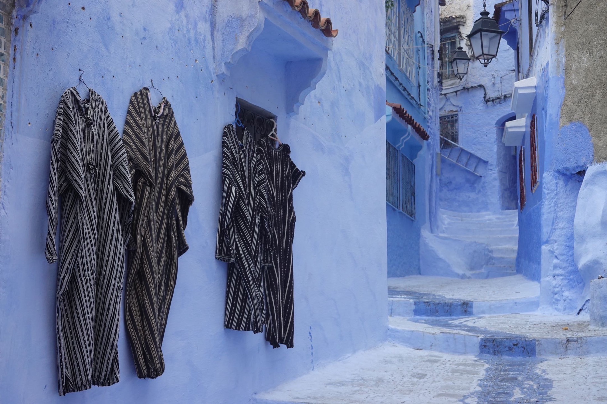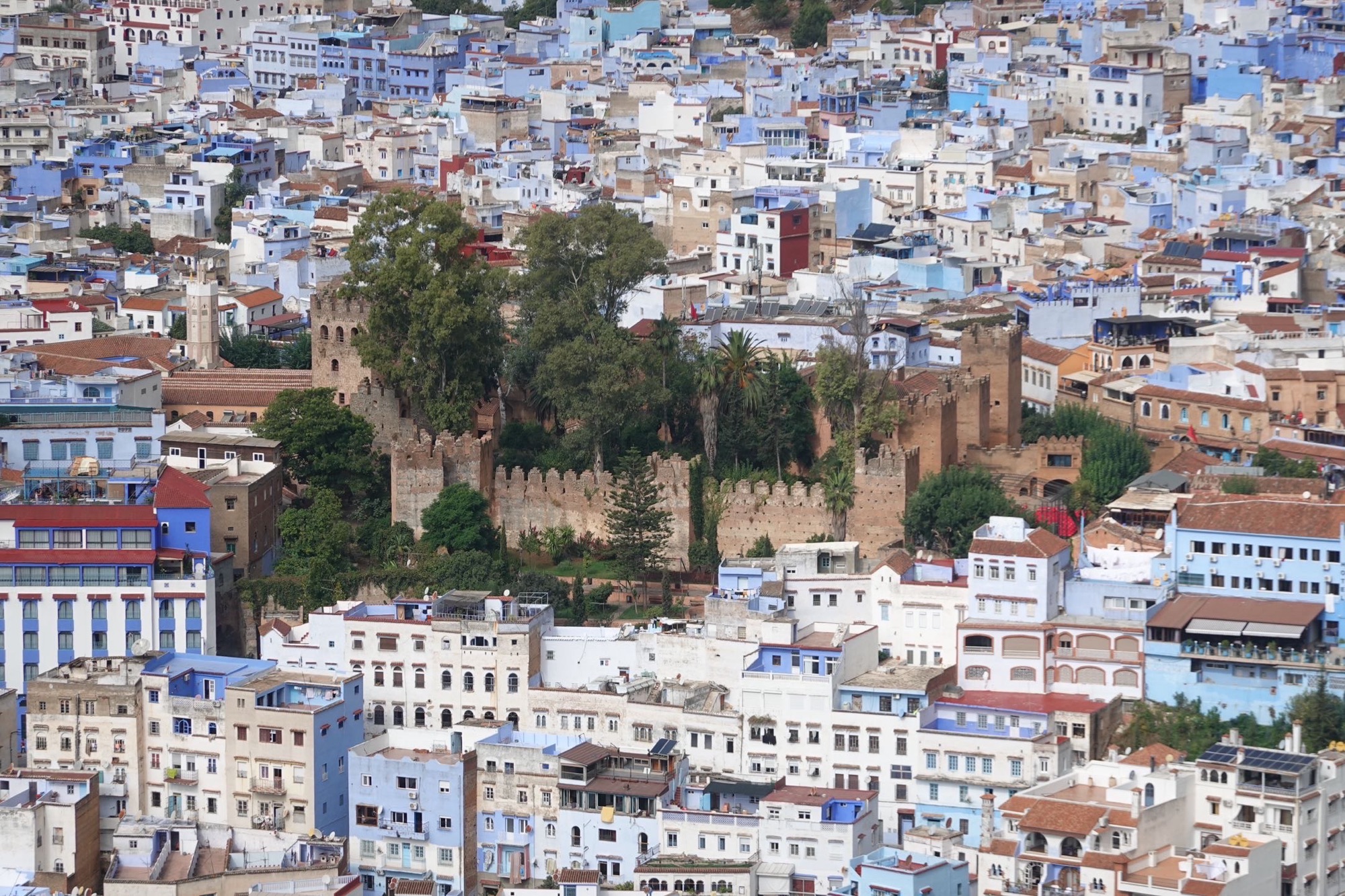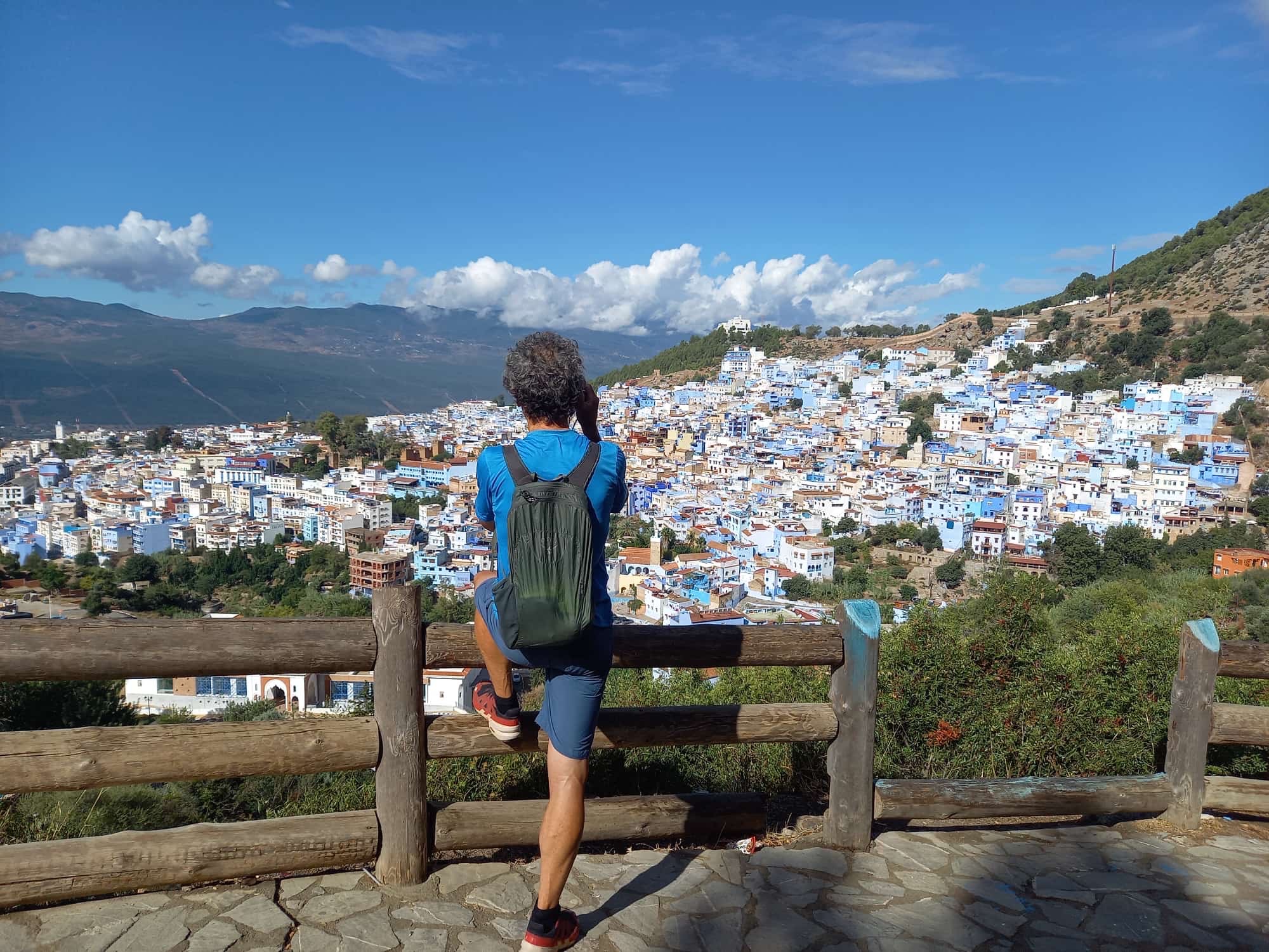 Hinter unserem Hotel beginnt die historische Medina von Chefchaouen. Sie erstreckt sich über einen Hügel im Rif-Gebirge und besteht aus vielen engen Gassen mit typisch marokkanischen Souvenirläden. Alle Häuser, jede Gasse, jede Treppe sind blau-weiß getüncht. Die blaue Farbe sollte ursprünglich vor dem bösen Blick schützen. Später wurde sie initiiert, um Touristen anzulocken. Und die kommen zahlreich. Auch im Oktober. Aus vielen verschiedenen Ländern, aber die meisten sind aktuell arabische Tagestouristen. In den 1960er Jahren kamen vor allem Hippies in die Stadt. Angelockt vom Haschisch-Anbau. Chefchaouen war und ist eines der Zentren des verbotenen, aber trotzdem geduldeten Anbaus. Heute kaufen die Touristen eher Kaftans, Schmuck und Nippes. Wir kaufen nichts. Schlendern trotzdem durch die Stadt und essen ein marokkanisches Menu. In der Nacht gewittert und stürmt es.