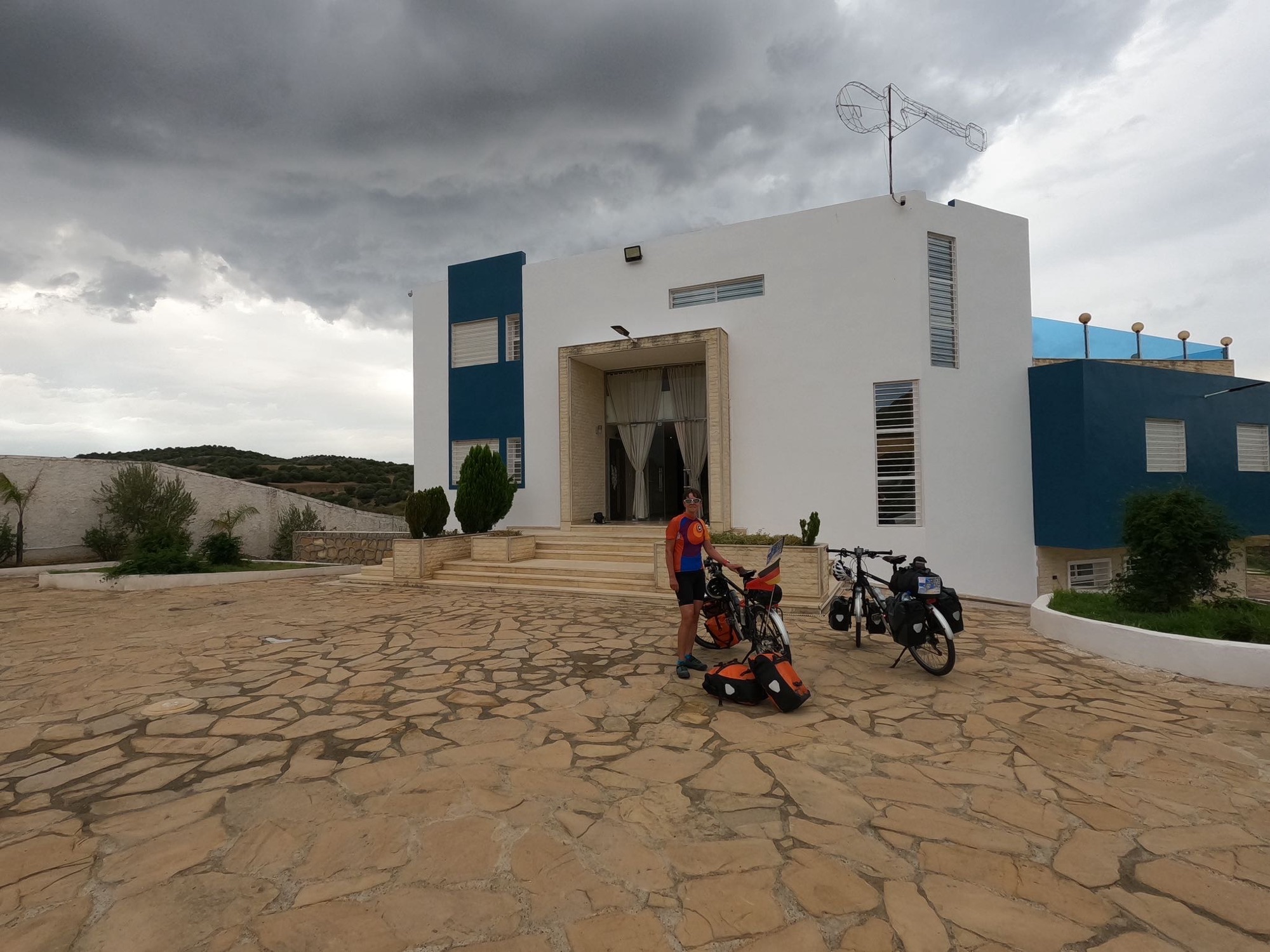 Am Ende unserer Strecke fahren wir durch Alleen mit riesigen Eukalyptusbäumen. Ihre Stämme sind über einen Meter dick. In der Nähe von Ouezzane haben wir ein Chambre d‘Hôte gefunden. Eine weiße Mauer umgibt es. Wir klingeln an dem Tor. Es öffnet automatisch und wir kommen in einen großen grünen Garten. Der Besitzer empfängt uns freundlich auf Deutsch. Er hat in Aachen mehrere Praktika gemacht. Es ist ein luxuriöses Haus. Überall sind Gitarren, auch der Pool hat die Form einer Gitarre. Das Steckenpferd des Gastgebers. Schwimmen entfällt jedoch. Das angekündigte Gewitter kommt 15 Minuten nach unserer Ankunft mit Starkregen und heftigem Wind. Perfektes Timing. Unser Gastgeber kocht für uns das perfekte Abendessen. Nur aus frischen Zutaten aus seinem Garten. Es ist das beste Essen auf unserer Tour. Und Sabine ignoriert ihre Probleme mit dem Magen.