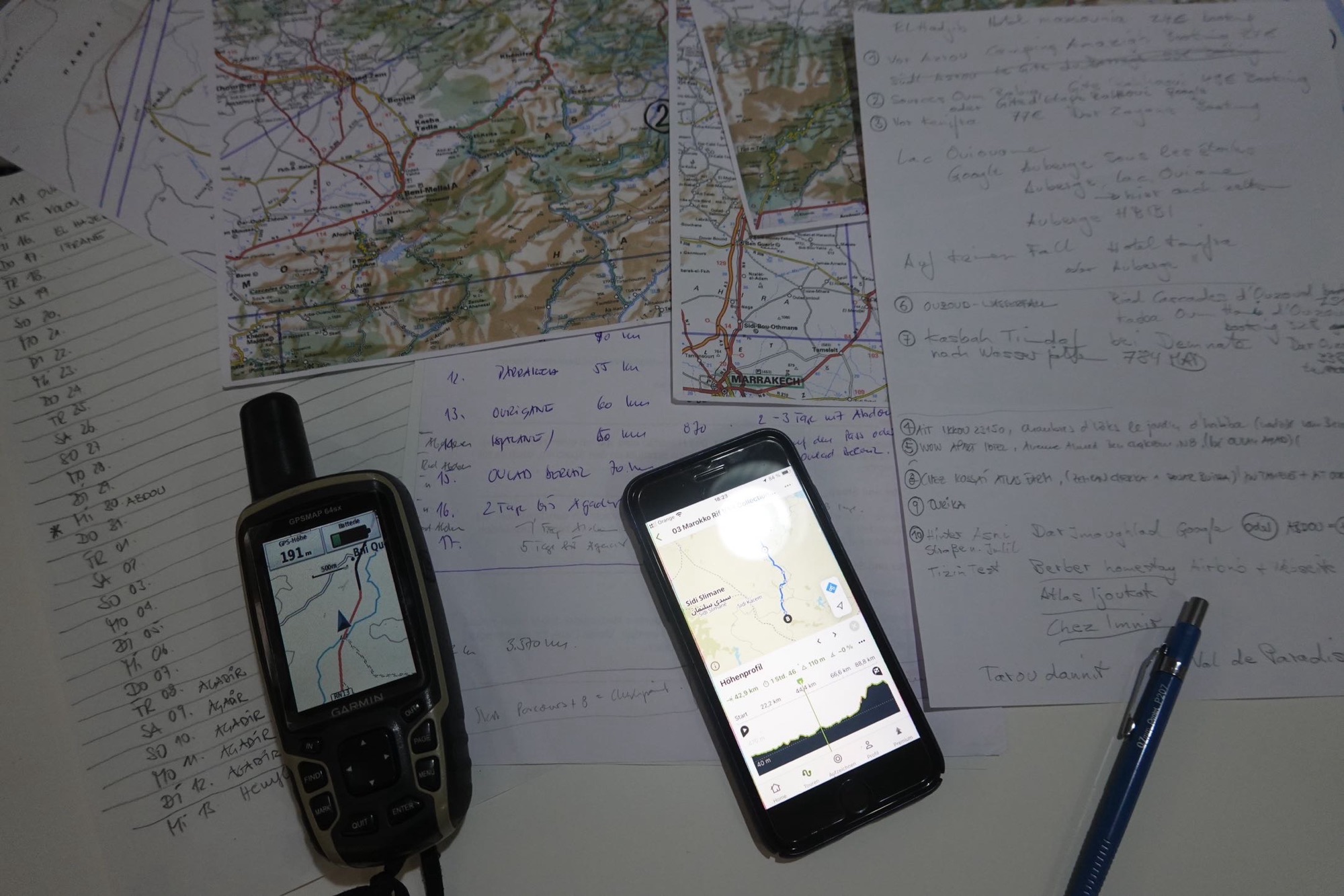 Dann geht’s los mit Planen. Die Richtung und das Ziel sind klar. Doch welche Straßen wählen wir, wo gibt es Übernachtungsmöglichkeiten, was wollen wir uns ansehen…? Wir sitzen bis spät abends da und planen. Zwischendrin essen wir in der Medina eine Pizza und treffen Wildrik wieder. Wie so oft treffen wir Leute immer zweimal. Wir telefonieren mit Abdou. Jetzt wissen wir sicherer, wann wir in Imlil sein werden. Es passt nicht ganz. Abdou geht am 03. November mit einer Gruppe in die Berge. Dann müssen wir vorher dort sein. Bis Agadir sind es dann noch 10 Tage. Am 13. November ist unser Rückflug. Das sind die Fixdaten. Wir versuchen, die Strecke aufzuteilen und Unterkünfte zu finden. Eine Menge Arbeit, aber das gehört halt jetzt zu unserer Reise dazu. Einfach drauflosfahren können wir nicht mehr.