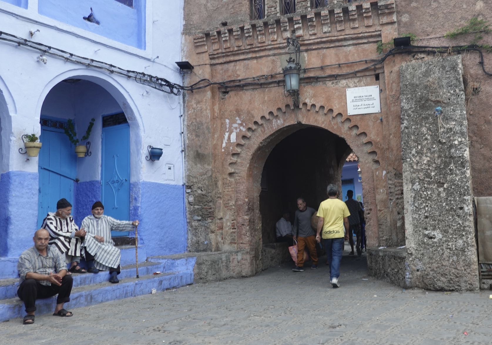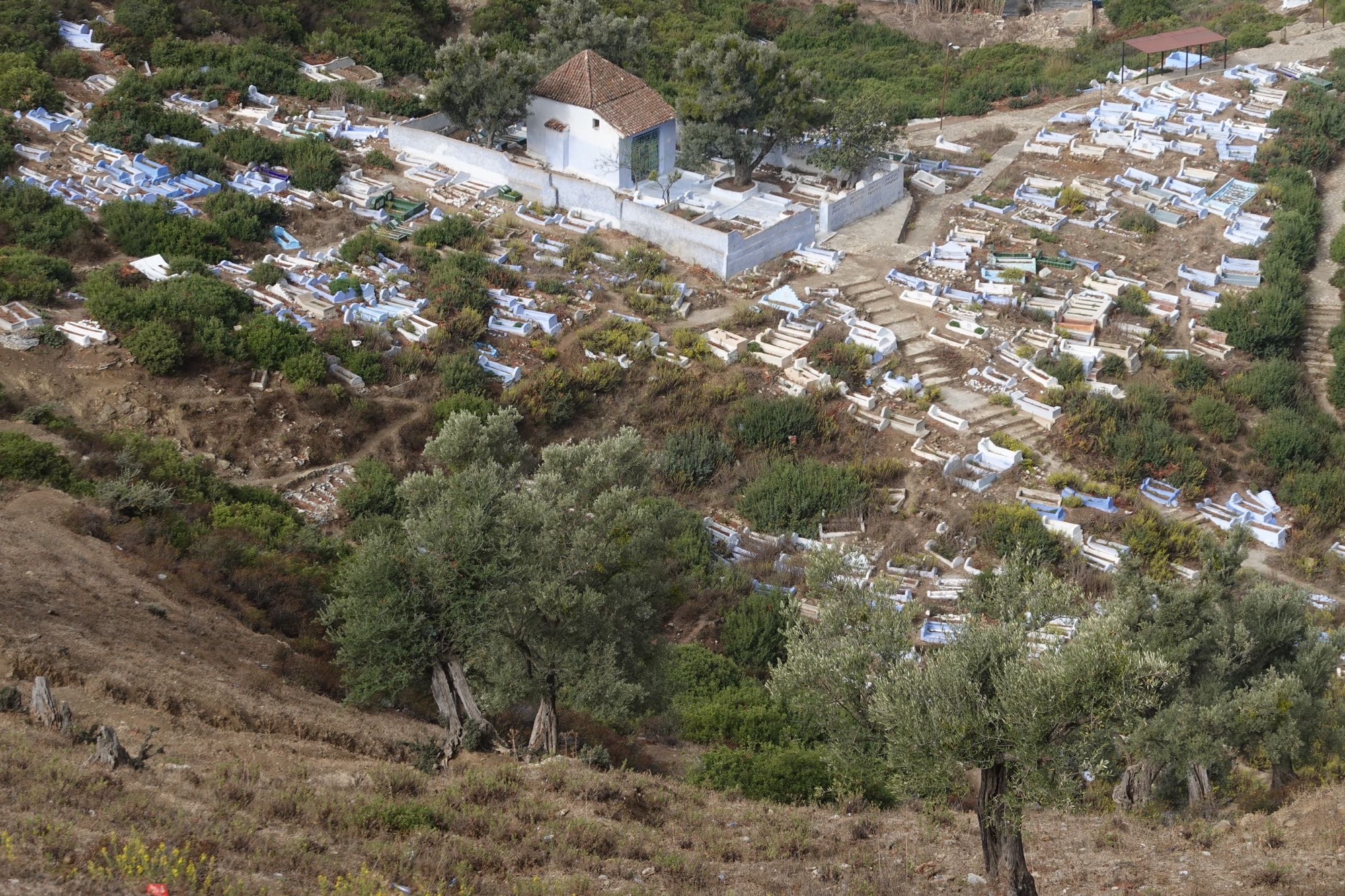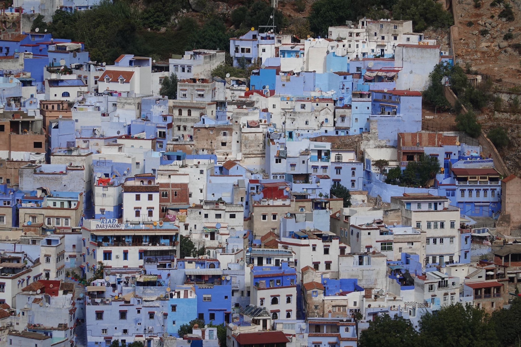 Über den Feldweg kommen wir zur Hauptstraße. Sie ist meistens vierspurig und es ist weniger Verkehr als gestern. An einem Stausee treffen wir einen niederländischen Gravelbiker. Wildrik ist von Holland bis hierher gefahren. Ab Casablanca fliegt er zurück. Unsere heutige Stecke hat es in sich. Auf 50 km 1000 hm. Und die drei Kilometer lange Auffahrt in die blaue Stadt Chefchaouen erst recht. Mindestens 10% Steigung. Manchmal steiler und kein ebenes Stück dazwischen. In der Stadt geht es dann weiter über enge Gassen mit vielen Treppen. Deshalb haben wir ein Hotel an einer befahrbaren Straße gesucht. Als wir ankommen, ist alles geschlossen. Wir telefonieren. Der junge Host öffnet uns die schmale Eingangstür. Dahinter ist eine noch schmalere Treppe. Wie sollen wir hier die Räder hochtragen und wo sollen wir sie abstellen? Nicht vor der Tür. Der junge Mann hilft. Es gibt noch einen Hintereingang. Zwei Geschosse haben wir dann schon gespart. Und das Hotel hat eine Dachterrasse. Prima. Hier ist auch die Treppe breiter. Das ewige Fahrrad-Unterstell-Problem ist gelöst.