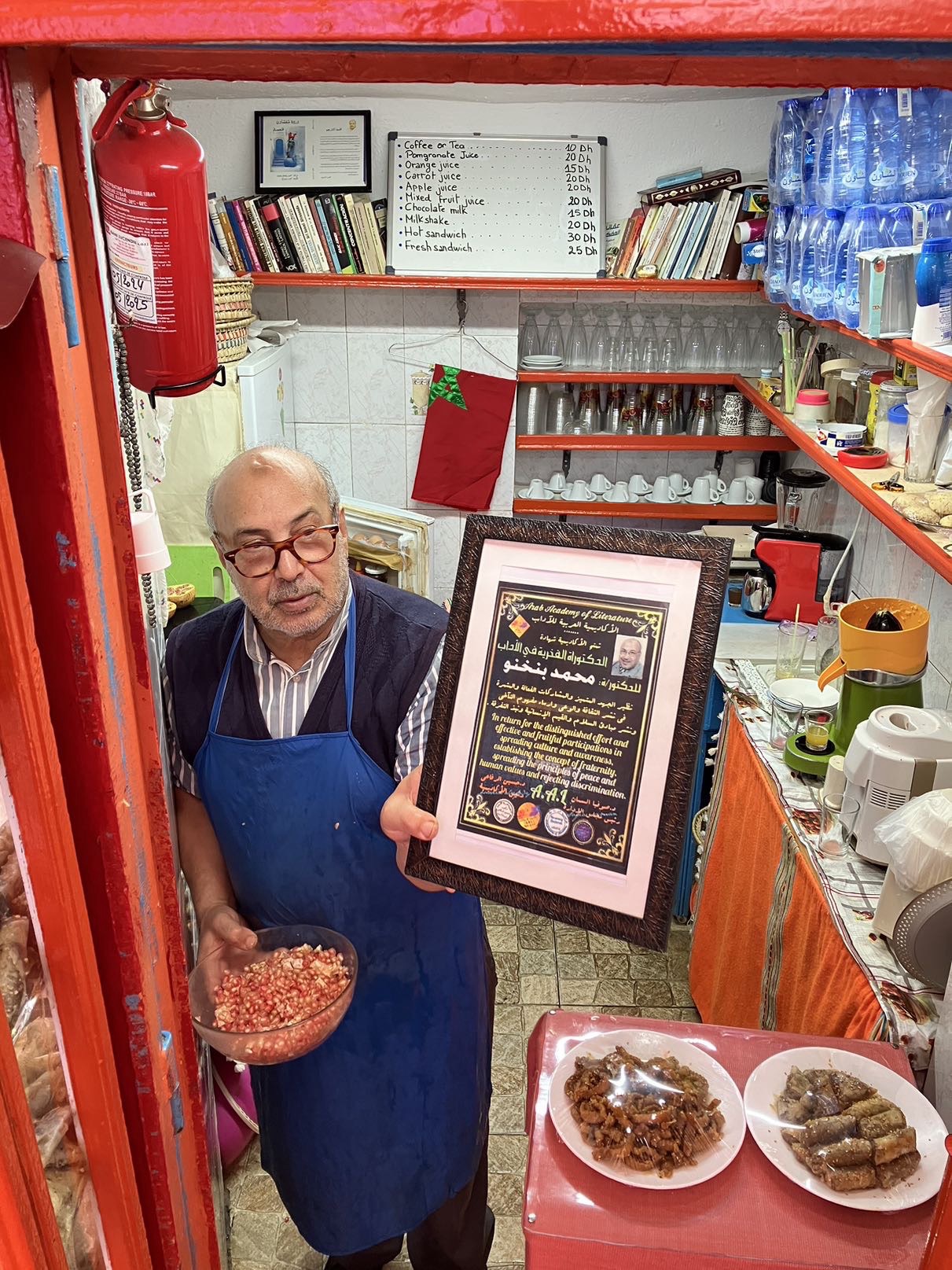 Wir suchen einen Saftladen. Überall werden frisch gepresste Säfte aus Orangen, Granatäpfel und anderen Obstsorten angeboten. Nicht alle Stände sehen hygienisch aus. Wir finden einen Laden mit der Aufschrift Natural Juice Bio. Na denn. Wir bestellen einen Granatapfelsaft ohne Eis. Wegen der Gefahr Magenprobleme zu bekommen. Natürlich ohne Eis, bei ihm ist alles Natur, versichert uns der Saftauspresser. Es ist ein vornehmer älterer Herr. Wir kommen ins Gespräch. Eigentlich ist er Schriftsteller. Er zeigt uns seine Bücher und Urkunden mit Literaturpreisen. Und hier verkauft er Saft. Das Leben in Marokko ist nicht einfach.