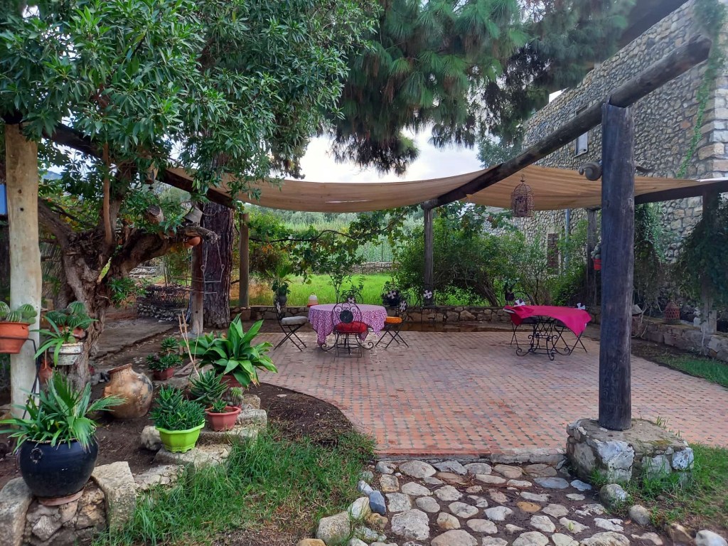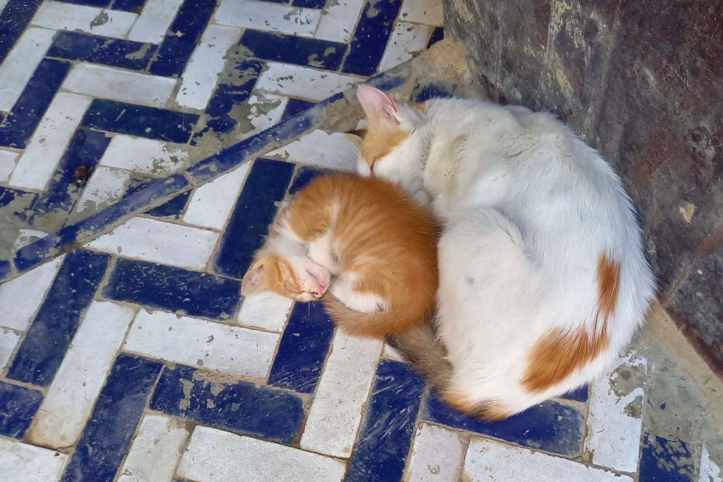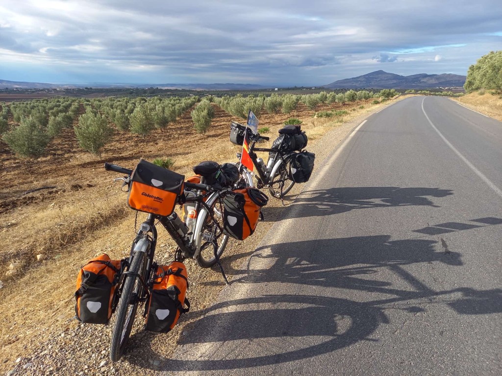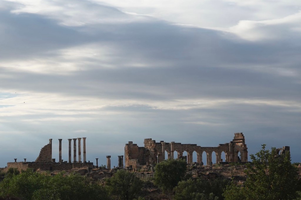 Es geht über einen Höhenrücken des Bergmassivs Zerhoun relativ flach durch Olivenhaine bis Volubilis. Kaum Autos, keine Hunde, keine Kinder, keine Passanten… Wir genießen die Ruhe und den Blick bis zum Mittleren Atlas. Die Fahrt war heute ziemlich aufregend, umso schöner ist ihr Abschluss. In Volubilis gibt es eine große Ausgrabungsstätte mit antiken römischen Tempeln, Wohnstätten und Mosaiken. Ein UNESCO Weltkulturerbe. Wir machen ein Foto und fahren weiter. Besichtigung morgen? Inschallah! Nach 90 km und 1000 hm möchten wir lieber direkt in unser Chambre d’hôte. Die Ferme Walili. Hier in der Nähe müsste sie sein. An einem verschlammten Feldweg. Wir finden sie zuerst nicht. Die Zufahrt ist vollständig von nassem Lehm bedeckt, von dem heftigen Regen gestern. Überall in Marokko gab es Unwetter. Sogar in der Sahara hat es nach 10 Dürrejahren das erste Mal geregnet. Wir werden freundlich empfangen und bekommen ein Abendessen der Extraklasse. Es gibt hier riesige Palmen, Zedern, Katzen, Hühner, Pfauen… und absolute Stille. Eine Oase nach dem aufregenden Radfahrtag.