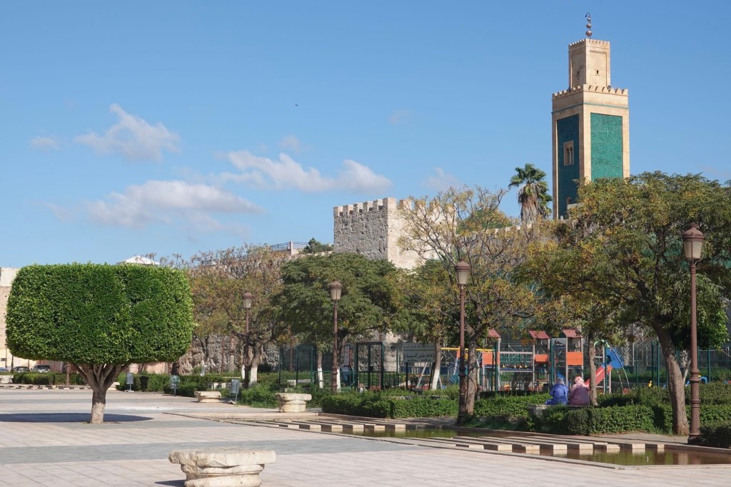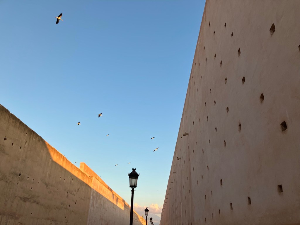 Von unserem höchsten Punkt haben wir Aussicht bis Meknès und die Berge des Mittleren Atlas. Schade, dass wir die Höhe nicht halten können. Durch drei Flusstäler runter und wieder rauf. Und dann kommt die Stadtdurchfahrt. Immer bergauf. Und höllisch Verkehr. Bestimmt 10 Kilometer. Meknès ist wohl die kleinste der Königsstädte, hat aber über 600 000 Einwohner. Wir haben ein Riad, ein typisches marokkanisches Haus, mit Garten -für die Räder-, etwas außerhalb gefunden. Mit dem Taxi fahren wir in die Medina. Leider wird das größte und prächtigste Stadttor Marokkos Bab Mansour gerade renoviert und ist eingerüstet. Meknès bezaubert durch seine riesigen Mauern um die Medina, die Königspaläste, Koranschulen und Moscheen. Es ist ein Bild wie aus 1000 und 1 Nacht. Vor allem, weil auch der Kalif Storch zu Hunderten in der Stadt angekommen ist. Überall auf den Mauern sitzen Störche und klappern. Etwas zerrupft von ihrem langen Flug sehen sie schon aus. In den insgesamt 40 km langen Mauern nisten Stare und Schwalben. Schade, dass wir nicht hinter die riesigen Mauern der Königsstadt schauen können. Dahinter ist heute eine Militärakademie und ein riesengroßer Golfplatz. Wahrscheinlich fliegen die Störche schon seit Jahrhunderten in genau diese Gärten der Königsstadt, die im 17. Jh. von 30 000 Sklaven gebaut wurde. Von Moulay Ismail, der viel Platz für seine 500 Frauen und 50 000 Pferde brauchte.