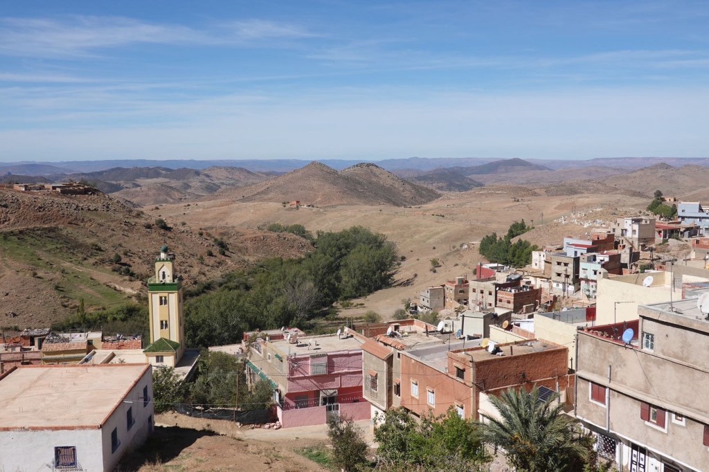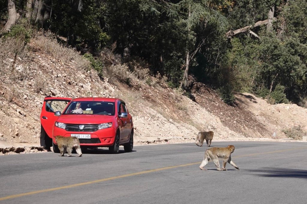 Wir sind begeistert von der Straße. Hier fährt kaum ein Auto. Nur ein paar organisierte Motorradtouren gibt es. Wir biegen auf die Hauptstraße nach Azrou ab. Dort haben wir eine Unterkunft mit Blick über die Stadt und das Tal. Doch zuerst müssen wir steil bergab. Durch Zedernwald. Zu schnell können wir nicht rollen lassen. Ab und an läuft ein Affe über die Straße. Kleine Äffchen spielen Fangen in den Bäumen. Verrückt. Am Abend genießen wir von unserer Terrasse die Abendsonne und die schöne Aussicht.