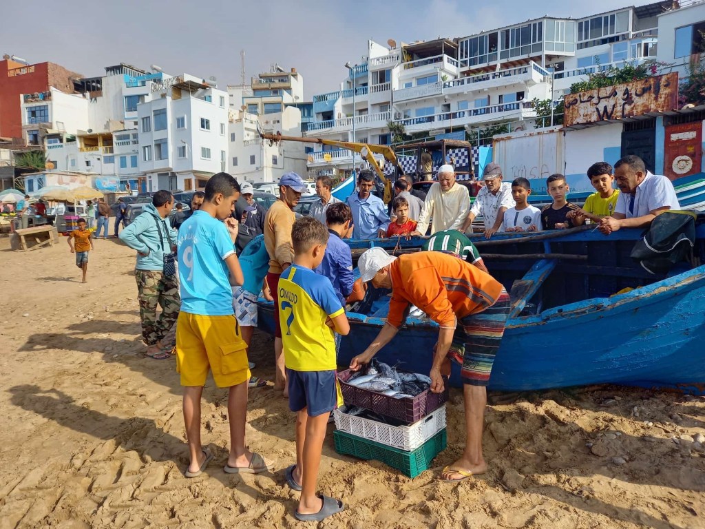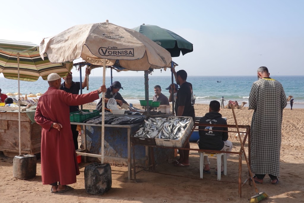 Wir schlendern durch die Gassen zum kleinen Stadtstrand. Gerade rechtzeitig um das Einlaufen der kleinen blauen Fischerboote zu beobachten. Sie rasen auf den Strand zu. Dann werden sie mit Ketten von einem Traktor hochgehievt und auf den Strand gefahren. Das Entladen ist eine spannende Sache. Sofort wird das Boot von mindestens 20 Männern umringt. Alle schauen nach dem Fang. Die Fische werden in Plastikkisten gelegt und sofort weggebracht. Einige werden direkt am Strand verkauft. Die anderen abtransportiert. Die umliegenden Restaurants bekommen täglich fangfrischen Fisch. Gesurft wird hier nicht.