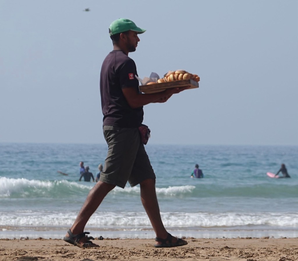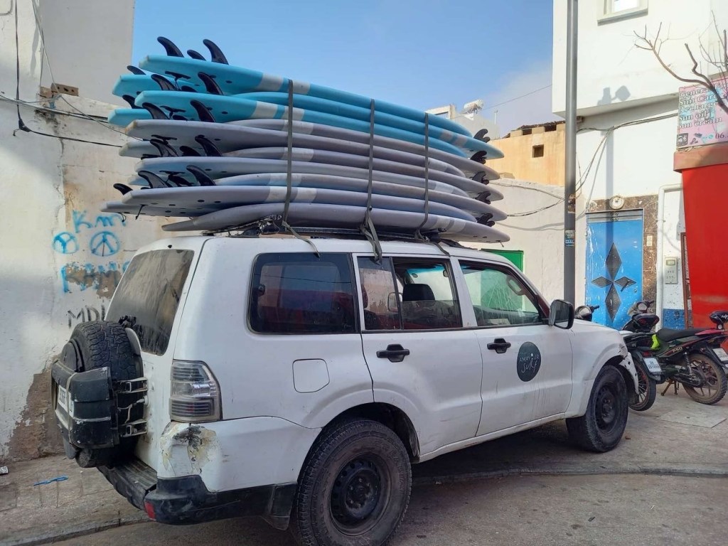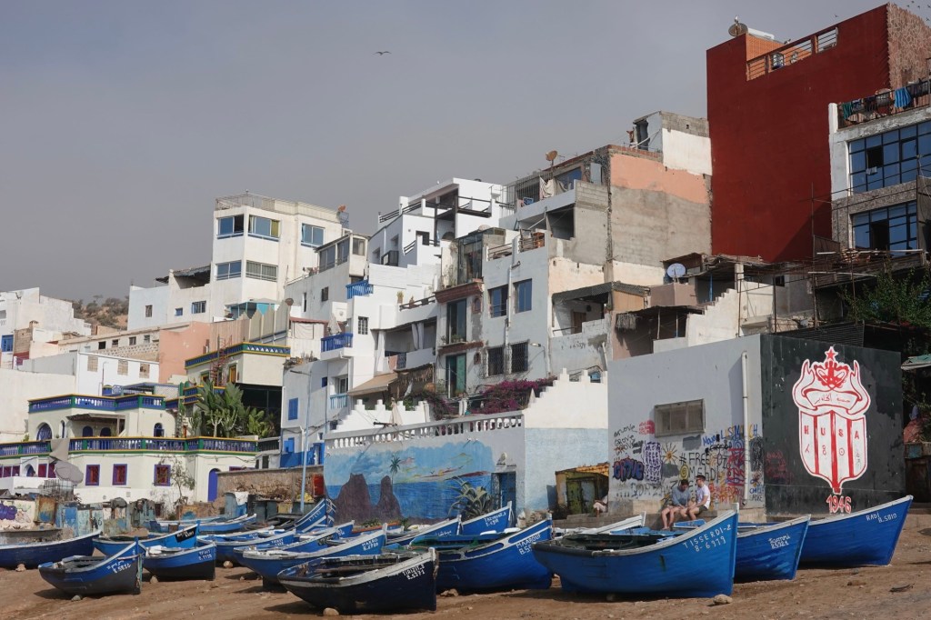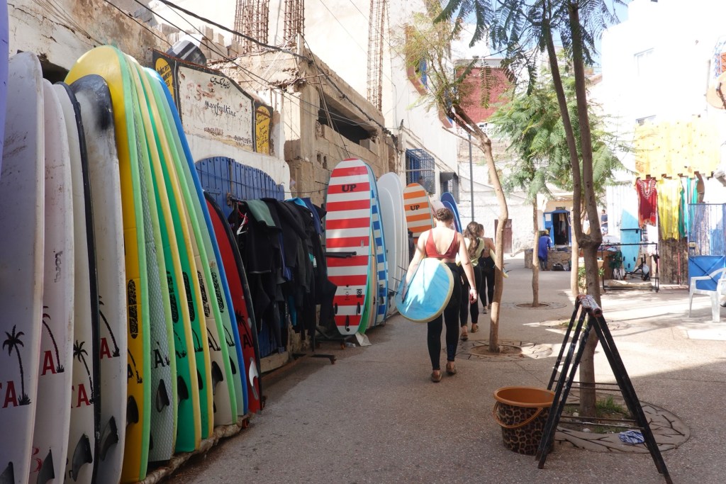 Mit einem Touristenshuttle Souk to Surf fahren wir nach Taghazout. Ein Badeort 30 km nördlich. Hier gibt es fast nur Surfer. Ein Surferhotspot für Könner ist gleich um die Ecke, nördlich an den Klippen. Südlich ist ein riesiger Strand für Normalos und Anfänger. Der Ort selbst ist etwas verlottert. Alternativ. Doch er hat seinen Reiz. Die weißen Häuser bieten Surfern alles, was sie brauchen. Kleine Wohnungen, Hostels,  Cafés zum Chillen, Rooftops zum Aussicht genießen, Yoga, Massage und vor allem Surfshops. In den kleinen Gassen stapeln sich hunderte Surfboards. Neoprenanzüge hängen da zum Trocknen. Schuster flicken Löcher in den Neos. In jedem zweiten Laden werden Boards verliehen und Kurse angeboten. Die Nachfrage ist enorm.