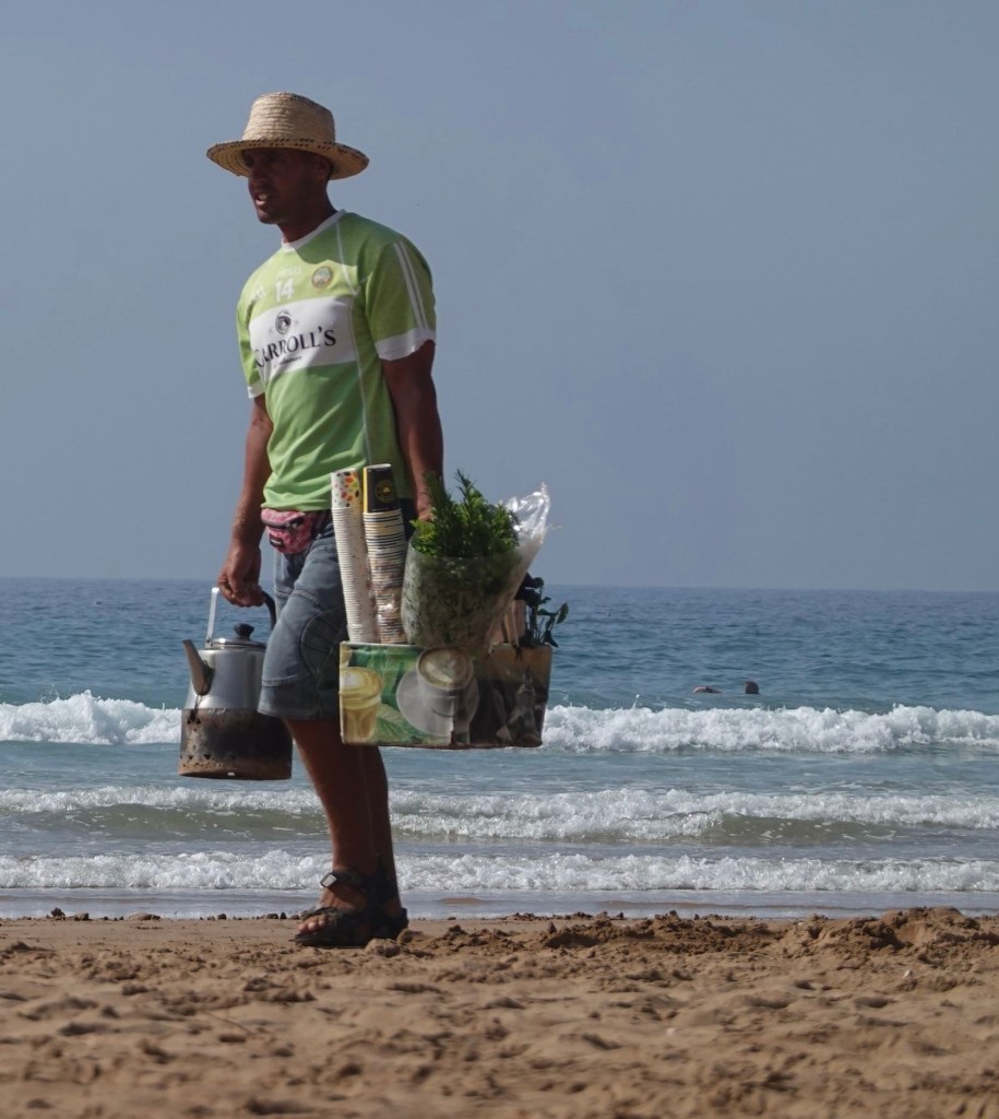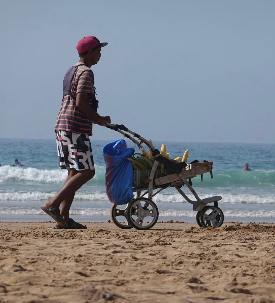 Unsere letzte Radtour war schon vorgestern. Morgen fliegen wir heim. Heute gehen wir ein letztes Mal ans Meer. Wir spazieren am Strand. Bis zu den Dünen in der Nähe des Sommersitzes des Monarchen wollen wir gehen. Doch schon hunderte Meter davor werden wir von uniformierten Wachposten zurückgepfiffen. Bis hierher und nicht weiter. Ringsum den Königspalast ist alles abgesperrt. Zutritt verboten. Obwohl er nie da ist. Ein Areal so groß wie ein Stadtviertel. Mit Palmengärten, Pools, Golfplätzen… und Bewachung durch unzählige königstreue Soldaten. Ringsum, rund um die Uhr…auch wenn sich keiner auf dem Gelände aufhält. Paradox. Wir gehen zurück. Und schauen den Surfern zu. Es sind weniger als gestern in Taghazout. Auch das Strandpublikum ist verschieden. Gestern lag der Altersdurchschnitt ca. bei 25-30 Jahren, hier heute sind nur ältere Leute unterwegs. Sie kommen aus den Resorts von Robinson, Sofitel etc..