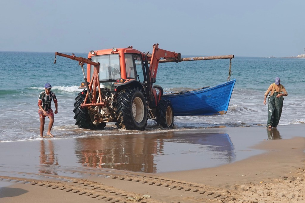 Die Fischerboote werden vom Traktor aus dem Meer gefischt.
