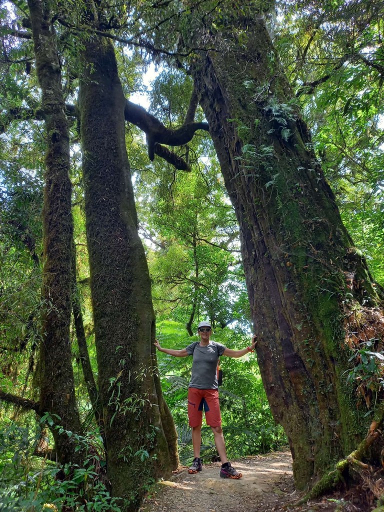 Die Tageszeiten sind hier anders als im Sommer zuhause. Es ist früh hell und früh dunkel. Wir stehen um sechs Uhr auf. Unser Campingplatzmann hat uns auch für heute einige Tipps mit auf den Weg gegeben. Auf jeden Fall sollen wir entlang der Küste fahren. Die andere Straße sei langweilig. Die neuseeländischen Straßen sind für uns alles andere als langweilig. Es gibt in Neuseeland ca. 40 Millionen Schafe , aber sicher ein Vielfaches an Kurven. Keine 50m gehen geradeaus. Und gestern liefen dann auch noch drei der 40 Millionen Schafe vor uns her. Und die Strecken sind so hügelig. Ständig geht es auf und ab. Das wird mit den Rädern ein täglicher Kampf. Die Landschaft ist einzigartig. Hunderte steile Vulkankegel bilden eine Topografie, wie es sie in keinem anderen Land gibt. Mit Regenwald zugewucherte Berge wechseln sich mit gerodeten Grasbergen ab. Auf den Gipfeln stehen Kühe und Schafe.