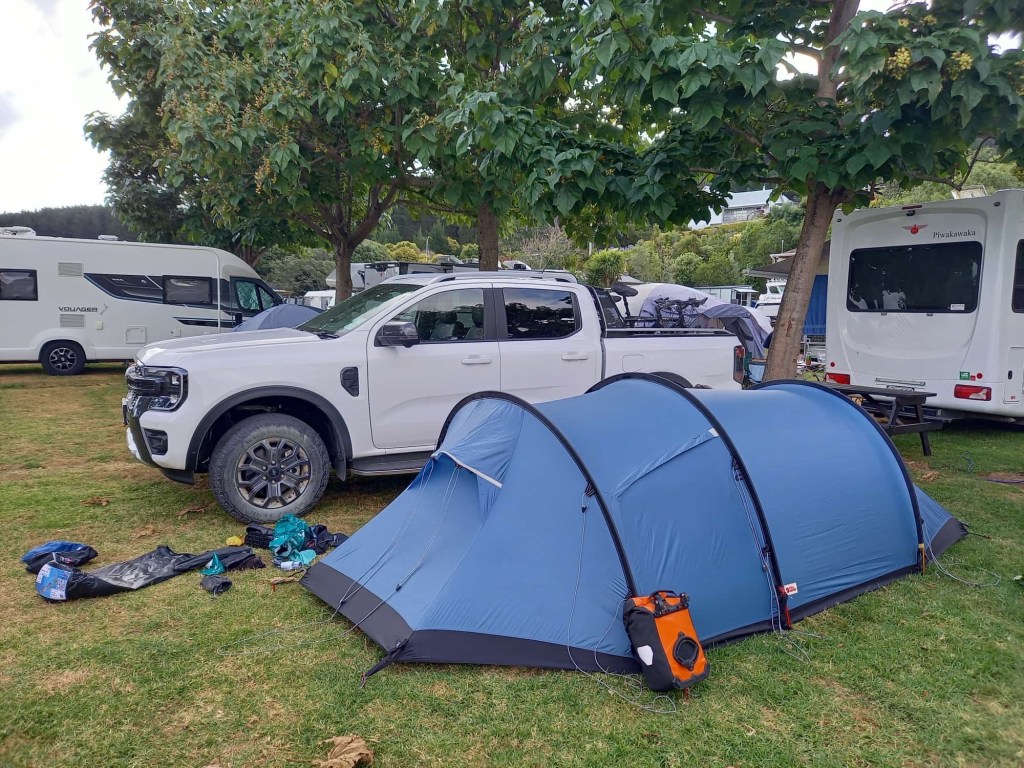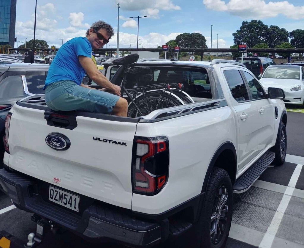 Ausgeschlafen fahren wir mit den Rädern zurück zum Flughafen. Wir wollen unseren Mietwagen abholen. Doch irgendwie haben wir an diesem Ort kein Glück. Sabine passt auf die Räder auf und Klaus möchte gerne den Schlüssel für das Auto. Es dauert. Mittlerweile stehen Leute hinter Klaus Schlange. Wir haben ein Problem. Angeblich ist die Gebühr für One-Way nicht bezahlt. Es soll 1.700 NZL-Dollar extra kosten. Das sind ca. 900 €. Klaus telefoniert mit der Hotline des Vermieters in Deutschland. Dort ist es Mitternacht. Der Mitarbeiter überzeugt den Neuseeländer, uns das Auto zu übergeben. Es ist ein Pick-Up-Geländewagen. Die Räder kommen hinten drauf, die Taschen auf den Rücksitz. Alles passt gerade so. Wir können endlich losfahren.
