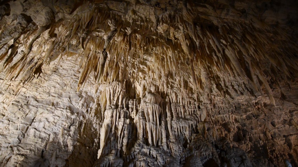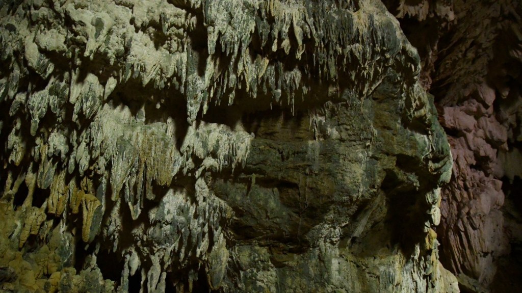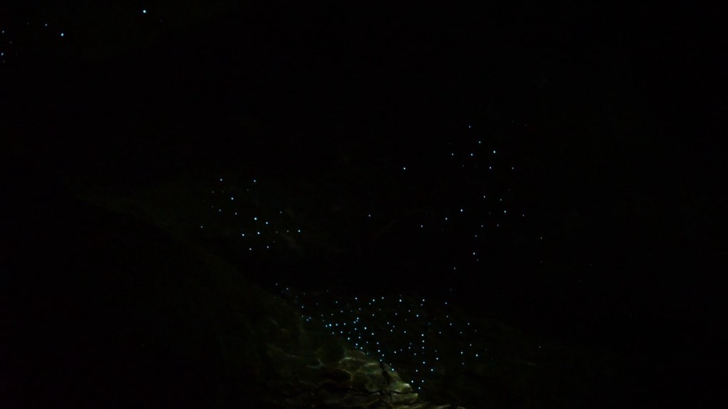 Wir gehen in die Höhle über eine lange spiralförmige Rampe in einem Betonzylinder. Unsere Höhlenwanderung dauert fast zwei Stunden. Wir sehen fantastische Säle mit Stalagmiten und Stalagtiten, Kalksteinformationen, unterirdische Flüsse und Glowworms. Letztere sind nicht zu verwechseln mit den Glühwürmchen zuhause. Es ist eine Spezies, die es nur in Neuseeland gibt. Es sind Larven, die durch eine chemische Reaktion leuchten. Sie locken Insekten in die Höhle. Für uns Besucher sehen sie in der dunklen Höhle aus wie ein Sternenhimmel. Beeindruckend. Wie der gesamte Tag.