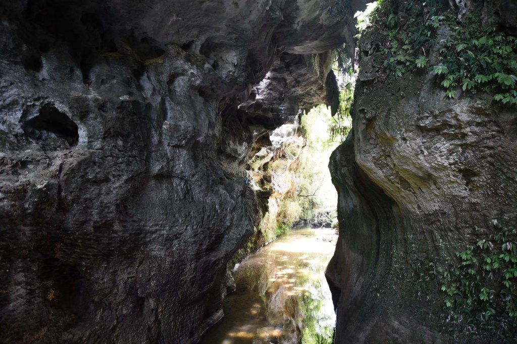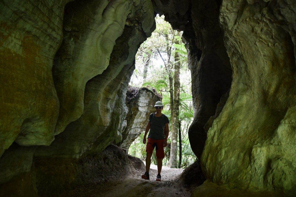 Auf unserer Strecke erwarten uns einige Highlights: Marokopa Falls, Piripiri Caves, Natural Bridge, Ruakuri Trail und schließlich eine der berühmten Höhlen in Waitomo, die Ruakuri Cave. Wir halten mehrmals an und wandern zu den Sehenswürdigkeiten. In Waitomo buchen wir auf dem Campingplatz die letzte mögliche Führung durch die Höhle. Die Ruakuri Cave (die Hundehöhle) wurde vor 300 Jahren von Māori entdeckt. Zwei wilde Hunde, Kuri, die im Eingang der Höhle lebten, griffen sie an. Sie flüchteten und bekamen von ihrem Häuptling den Auftrag, die Hunde zu töten. Der Eingang wurde zum Heiligtum der Māori, Tapu genannt. Deshalb wird der alte Eingang nicht mehr touristisch genutzt.
